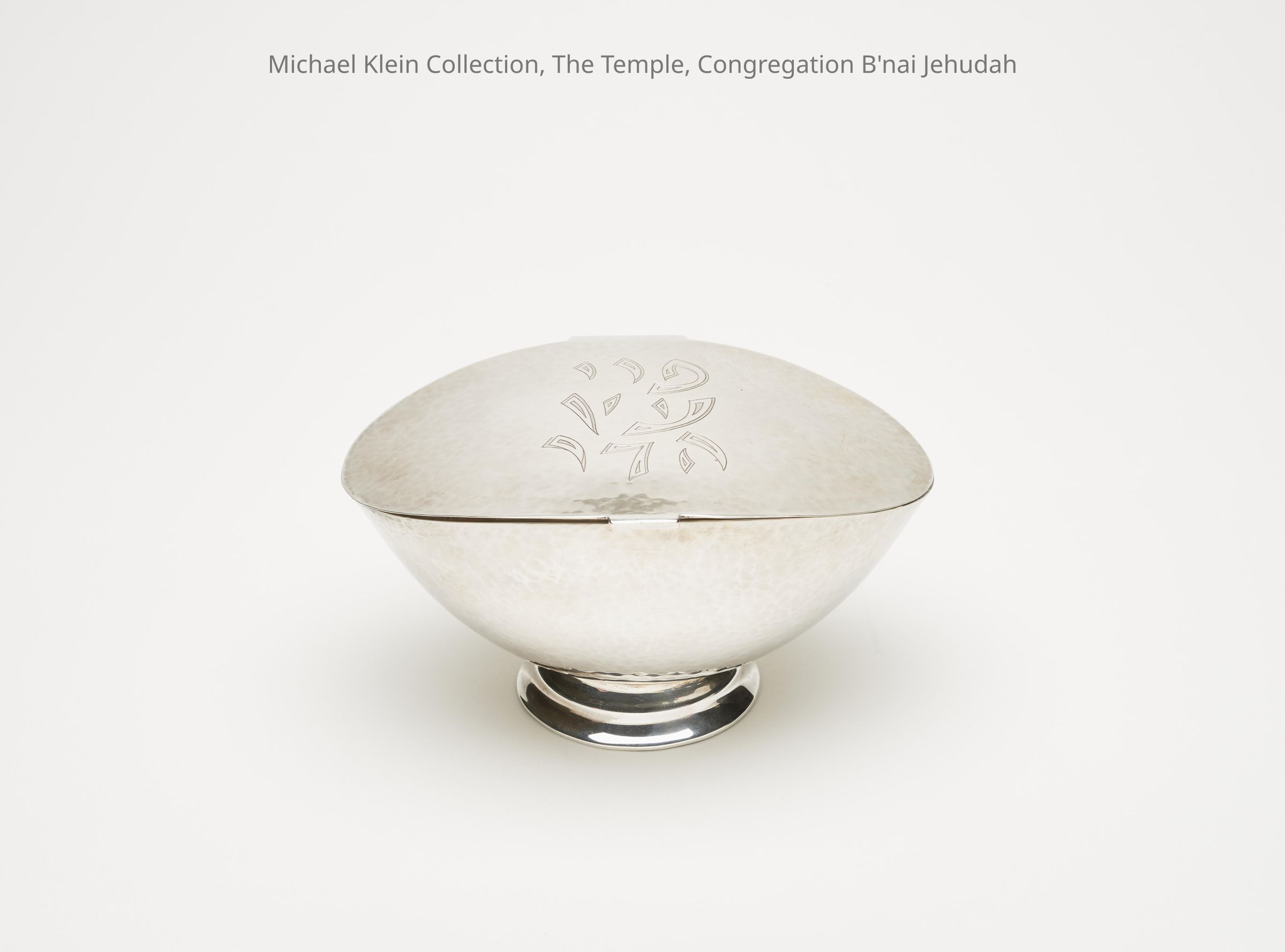 Hinged lid. Lightly hammered with engraving on lid, "Fruit of a goodly tree" (Leviticus 23:40)Made/Created