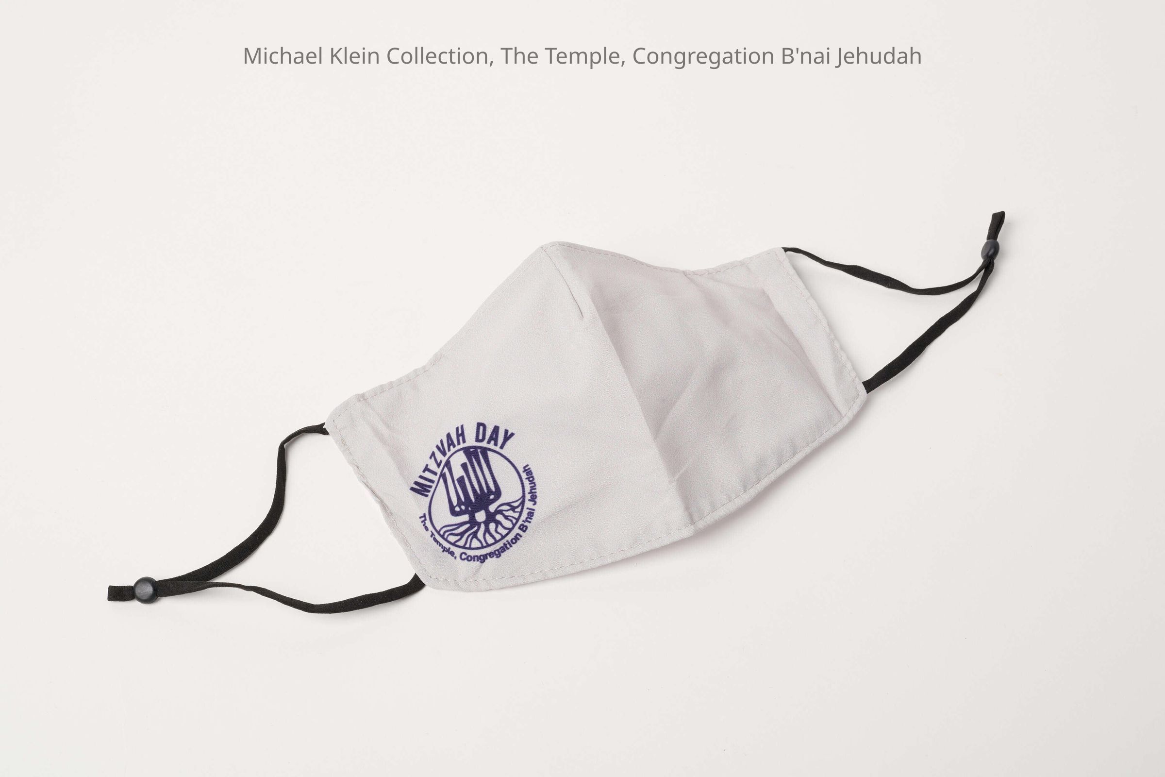 Gray face mask with black adjustable ear loops. Blue "Mitzvah Day" with TTCBJ logo and name on right side (as worn). Created for volunteers and staff for annual event, taking place during COVID-19 pandemic.Made/Created