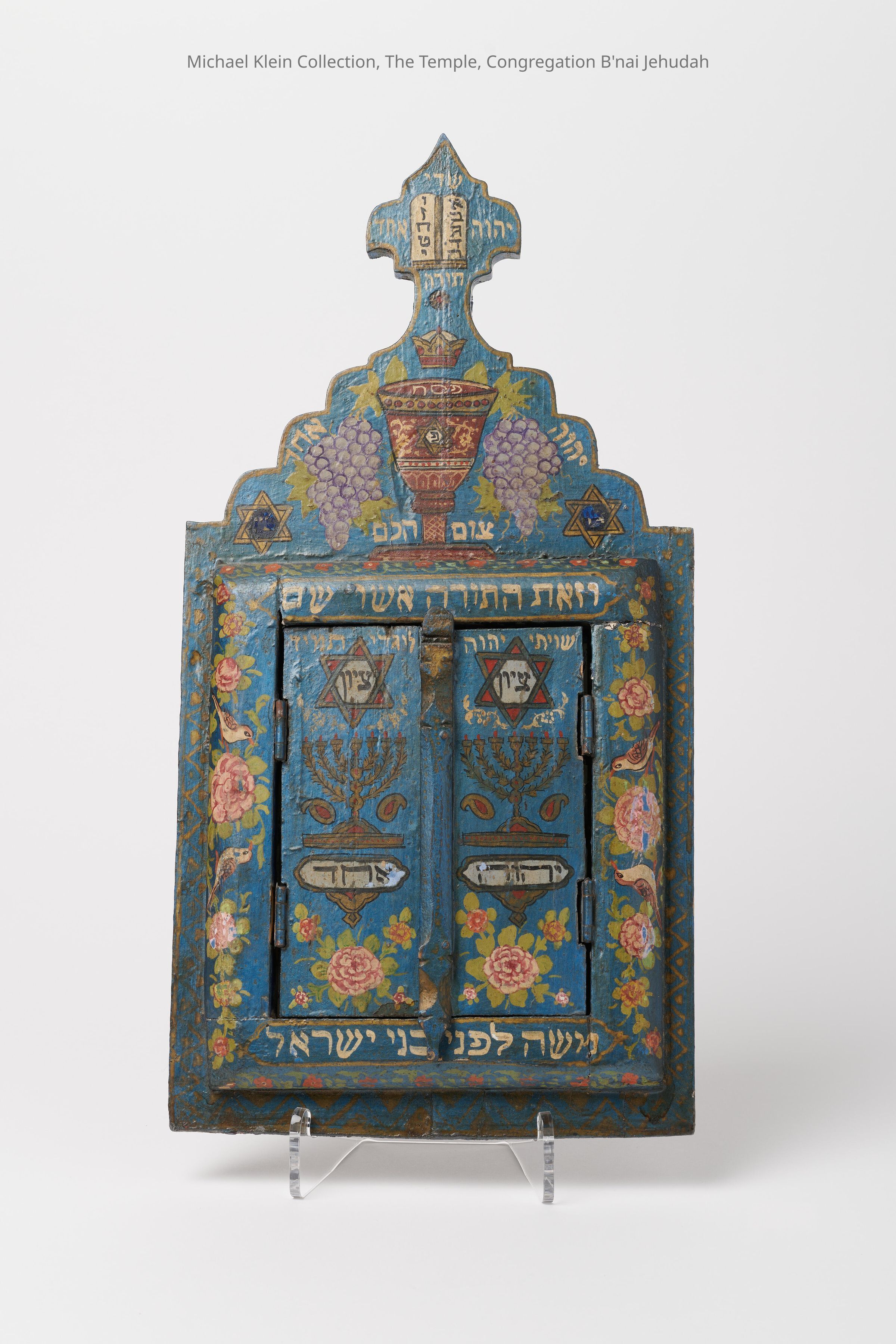 One of the most beautiful pieces of Jewish folk art we have ever been able to offer. Entirely hand-painted, filled with verses relating to holidays and what is found in the ark in the synagogue, as this is shaped like a Torah ark.Made/Created