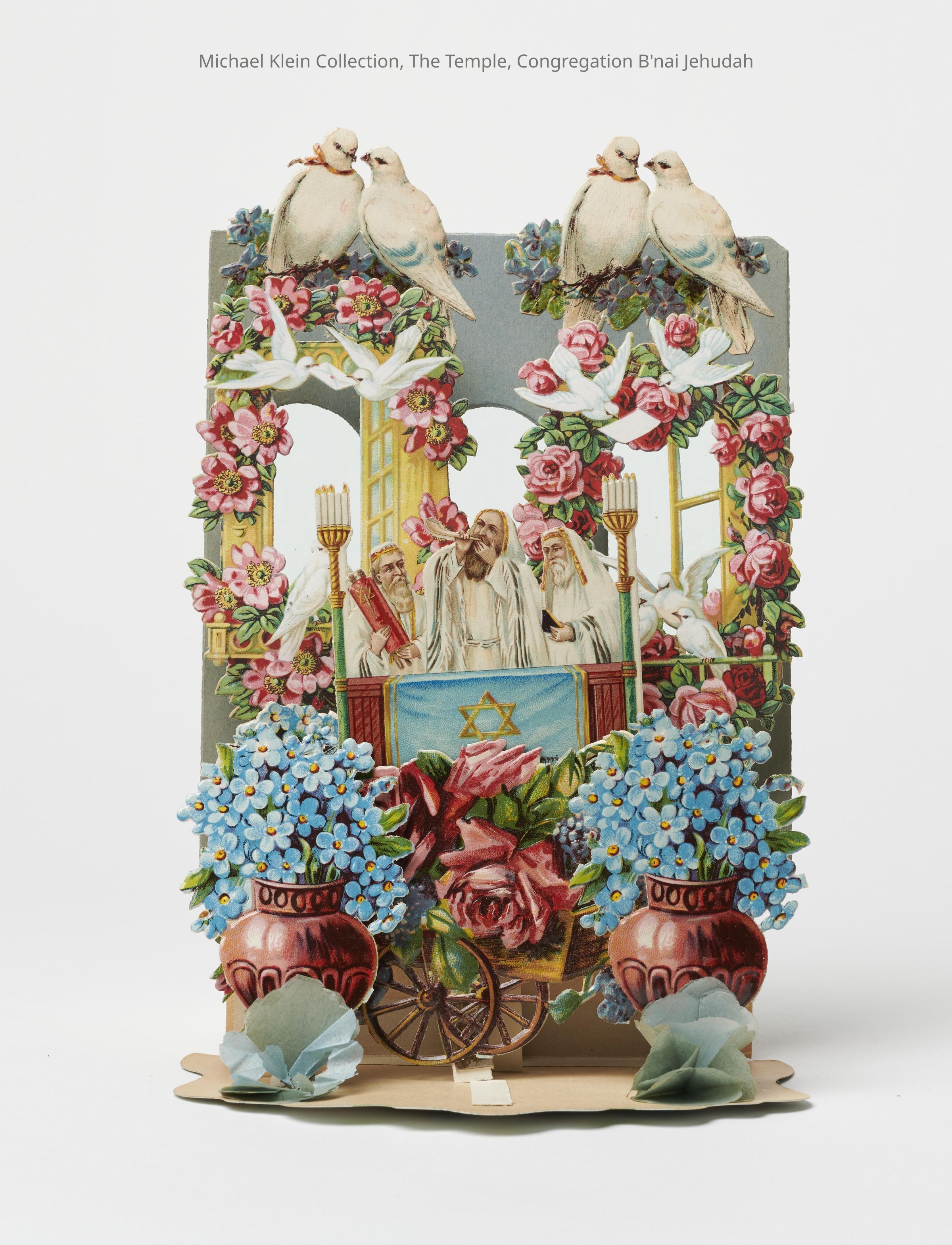 Printed in Germany for American market. Popup card for Rosh Hashanah, three rabbis at front holding torah, machzor and blowing a shofar. Two pairs of doves on top of card. Windows are covered with transparent sheets.Made/Created