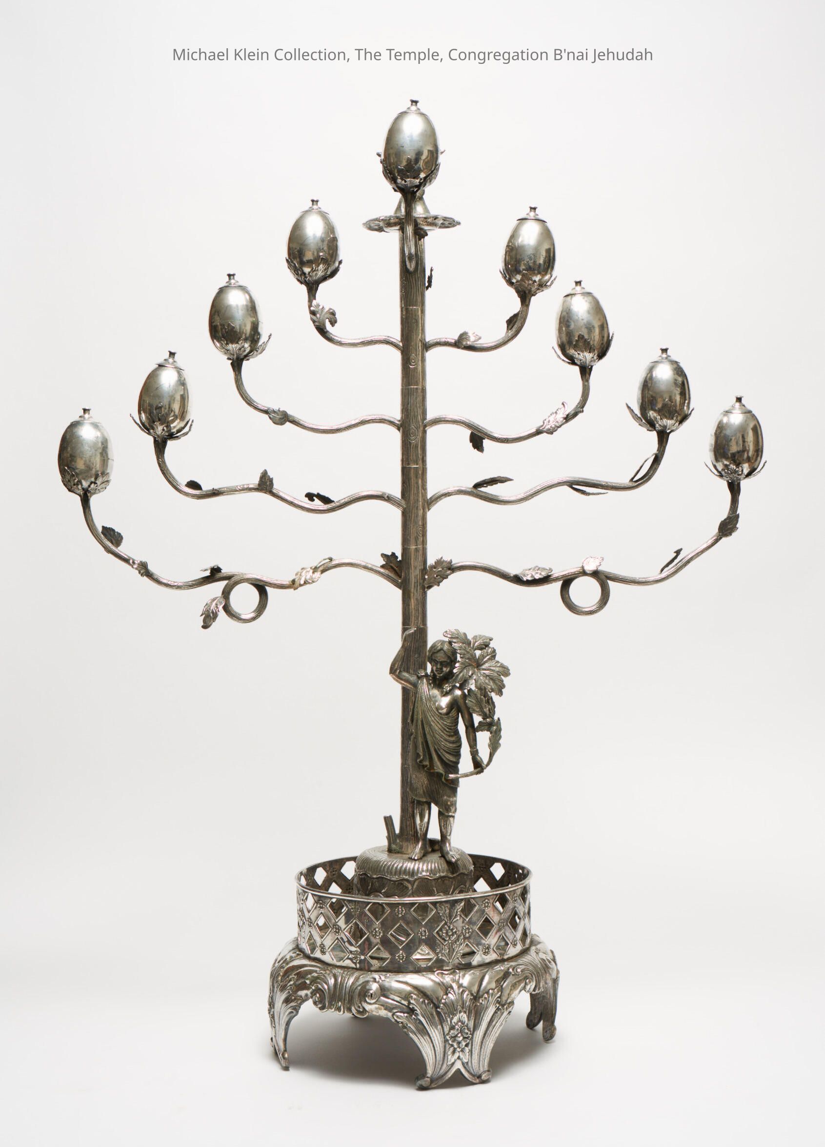 The base is decorated with sculptural figures of Judith with the sword in one hand and the severed head of Holofernes in the other, pointing to the relationship between the Hanukkah festival and the heroine Judith, who saves her people through a courageous, albeit gruesome, act saved. Another figure in the costume of a medieval Jew (?) is using a torch to light a miniature candlestick in the shape of a bush with a central trunk and three branches protruding from each side, the nozzles shaped like almond buds. The Book of Judith, an apocryphal on Wisely tortured to death because she