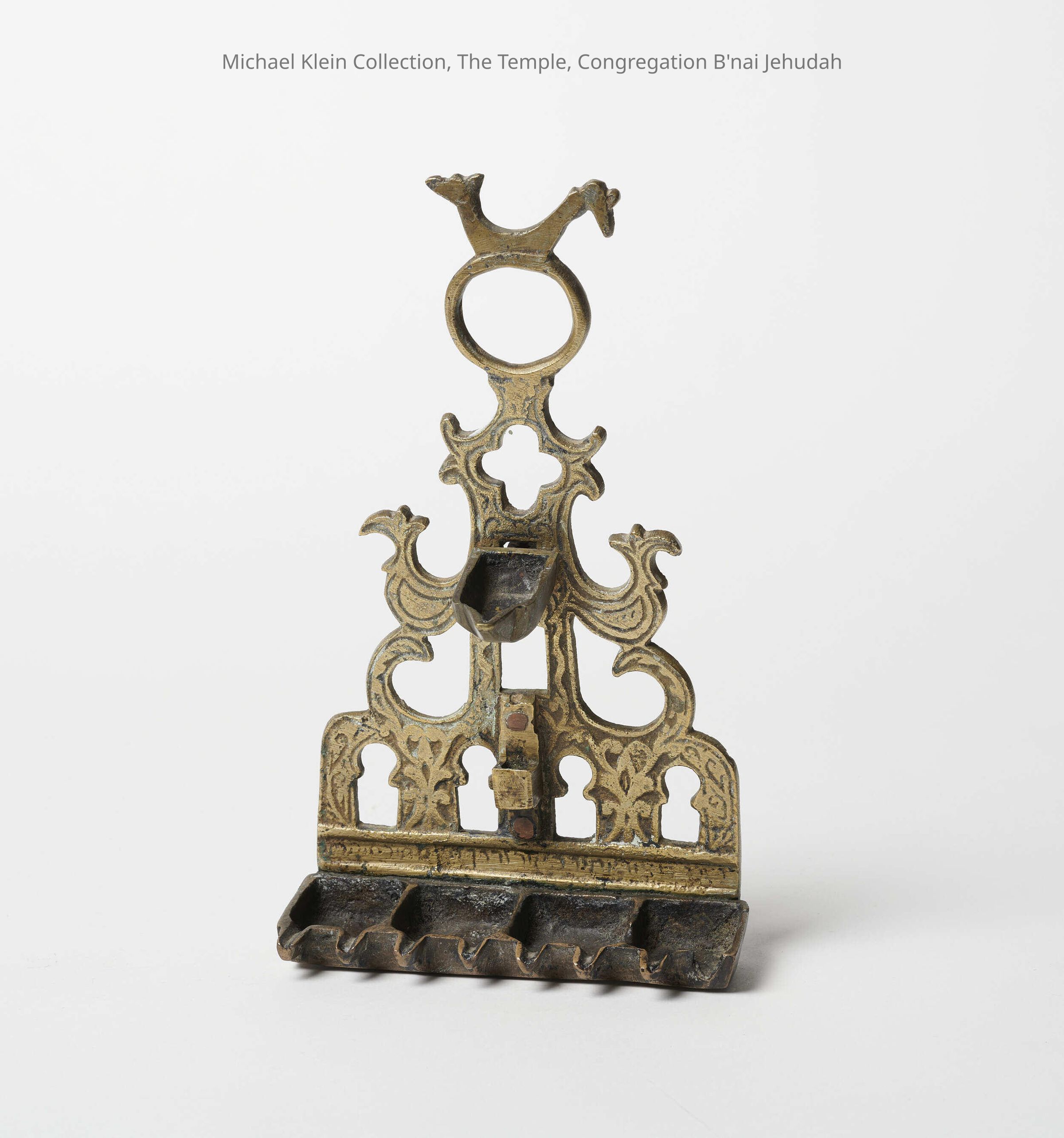 Back plate: openwork,with row of four horseshoe arches at bottom, and additional horsehoe arch in center above this row. Projecting image of bird surmounts apex of suspension ring which in turn surmounts "window" in shape of a four-petaled flower, situated above servajnt light attached to upper middle of back plate. Row of oil fonts consisting of four square pans,e ach with two pinched, pointed spouts for wicks (i.e., two lights per pan). Hebrew inscription (somewhat faded) on "windowsill" above oil fonts: "For the commandment is a lamp, and the law is light, and reproofs of instruction are the way of life" (Proverbs 6:23). Hook -- apparently for holding candlestick -- attached with copper rivets to middle of lower back plate between two pairs of "windows" in row of horseshoe arches.Made/Created