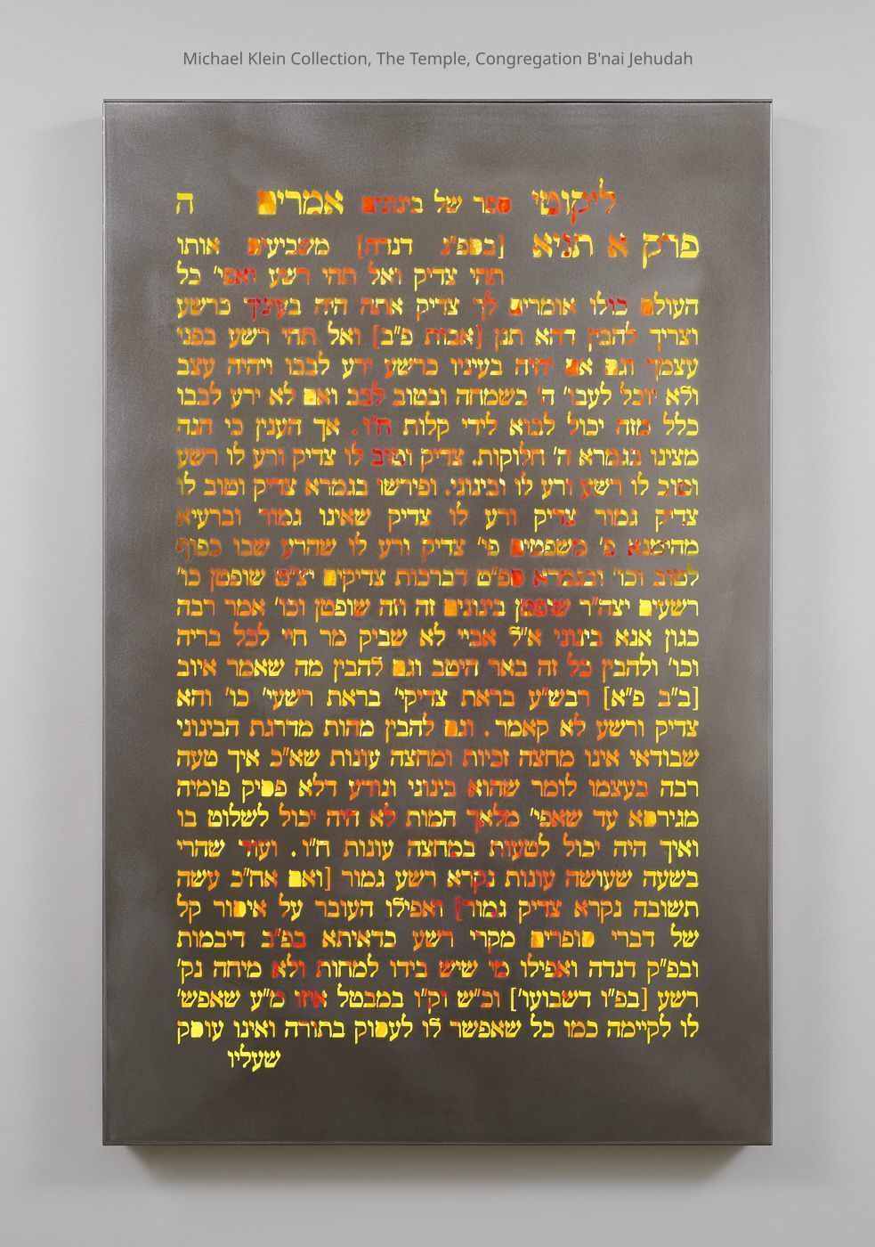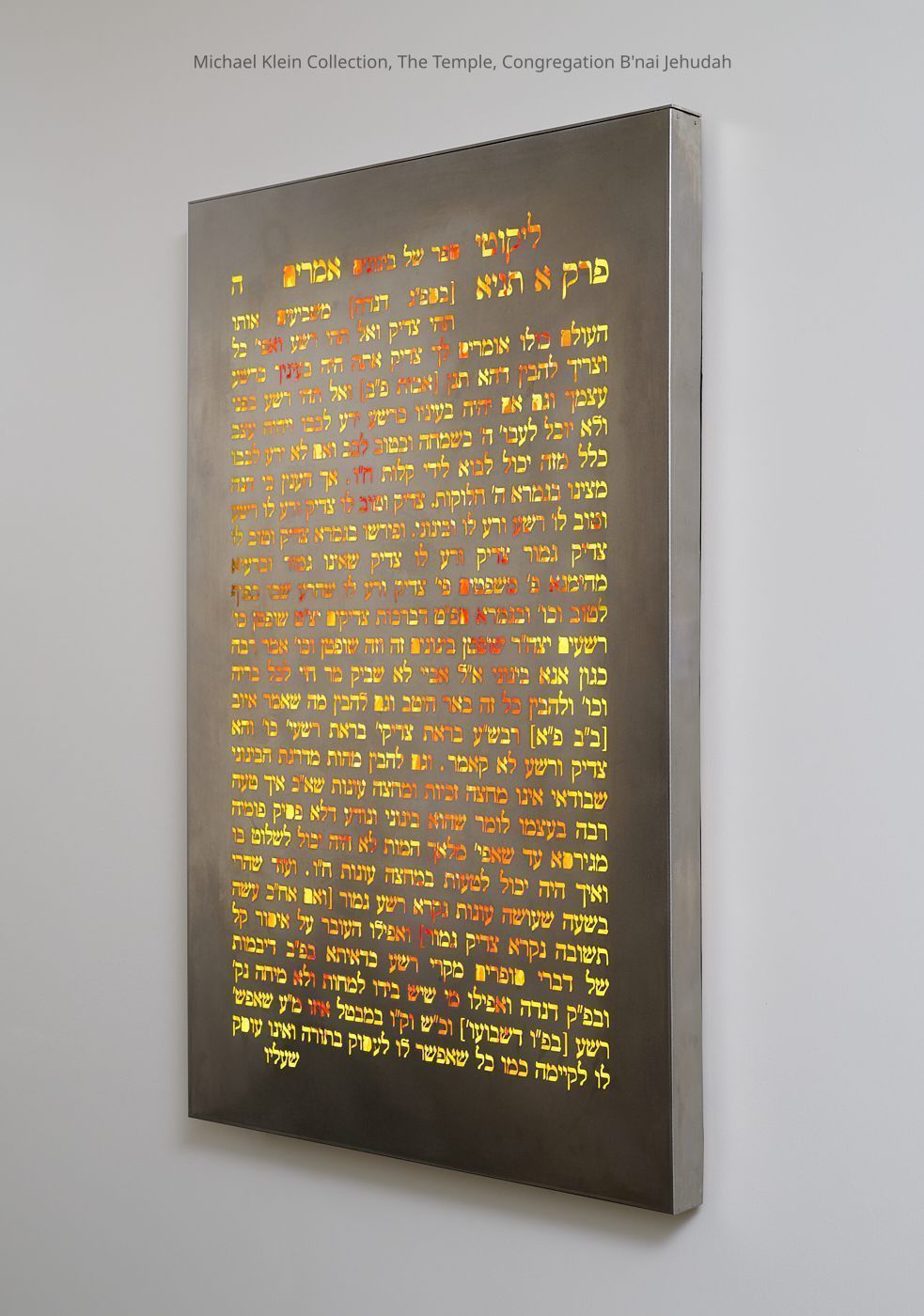 LED art installation. Stainless steel sheet punched through with Hebrew text, backlight in red and yellow with LED. Australian-American Chassidic artist. The "Tanya" is the foundational text of Chasidic Jewry.