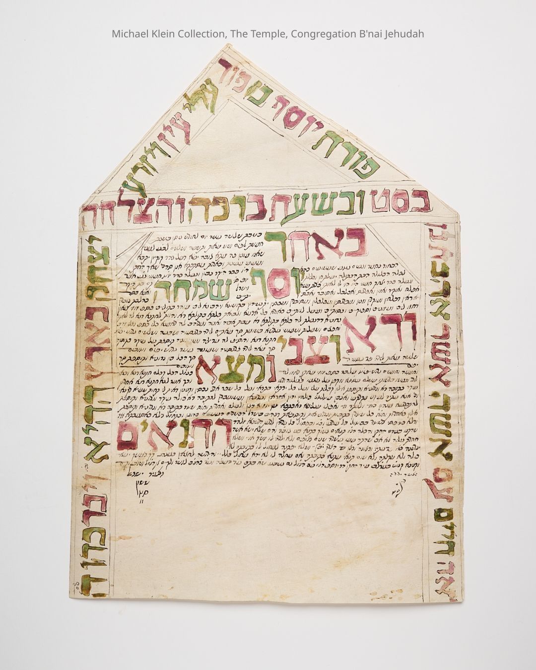 Parchment ketubah, for wedding of Yosef son of Yom Tov Chamawi and Simchah daughter of Yitzchak Chamawi. Aleppo, Syria, 13th Nisan 5639 [April 6, 1879]. Ketubah on small, rectangular parchment sheet with upper edge cut into a triangle, as a sort of pediment over a pair of pillars. Ketubah text in Sephardic cursive text, with seven words enlarged and written in hollow square letters and colored in purple and green. Edges surrounded by verses of blessing also written in large, hollow square letters, in matching colors. Signatures of witnesses on edge of ketubah text. For a similar ketubah, see: Sabar (2022), II, no. 306 (KET 161).Dimensions