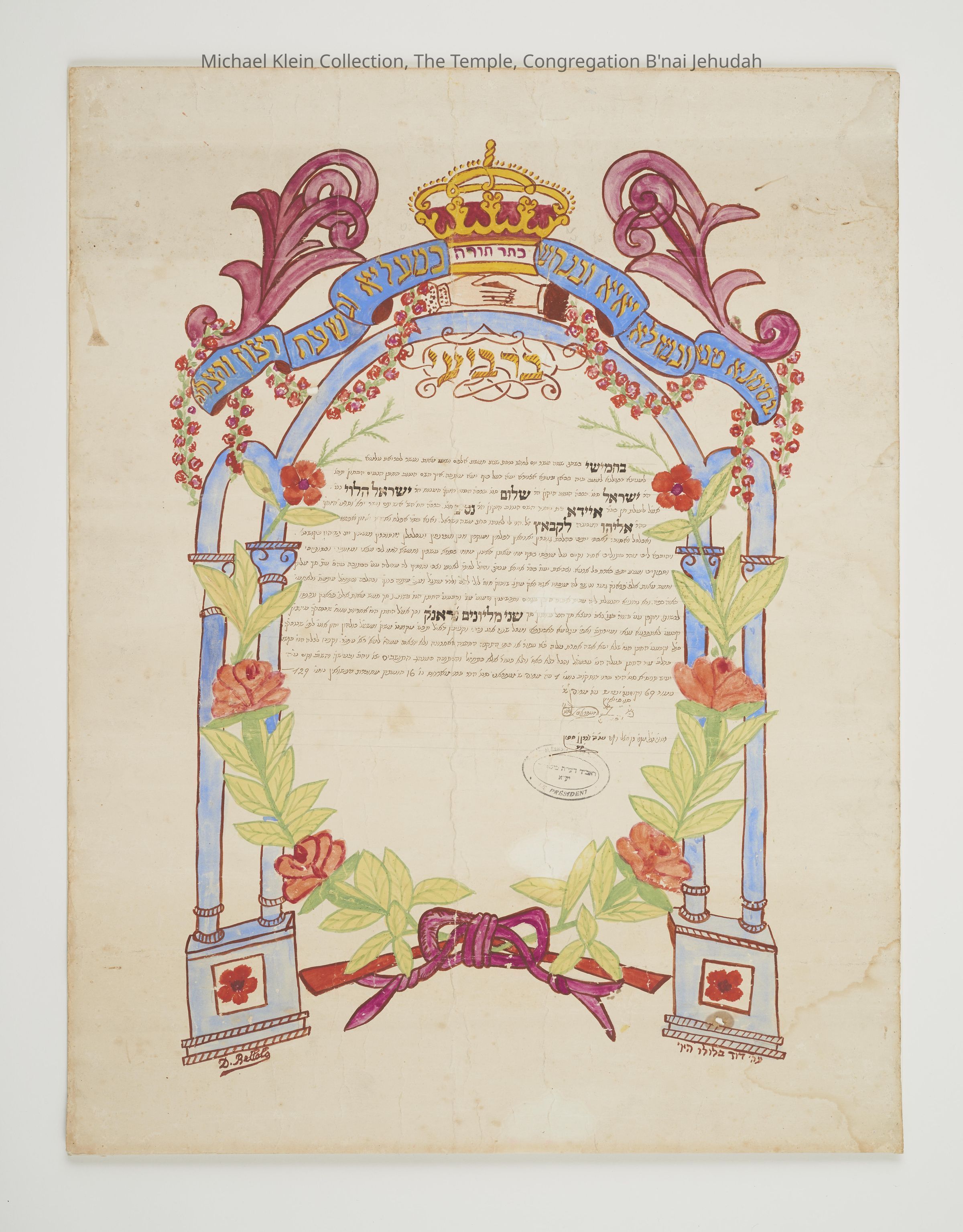 Hand painted on paper. Columns surmounted by crown and banner. Olive branches rising up from center.Made/Created