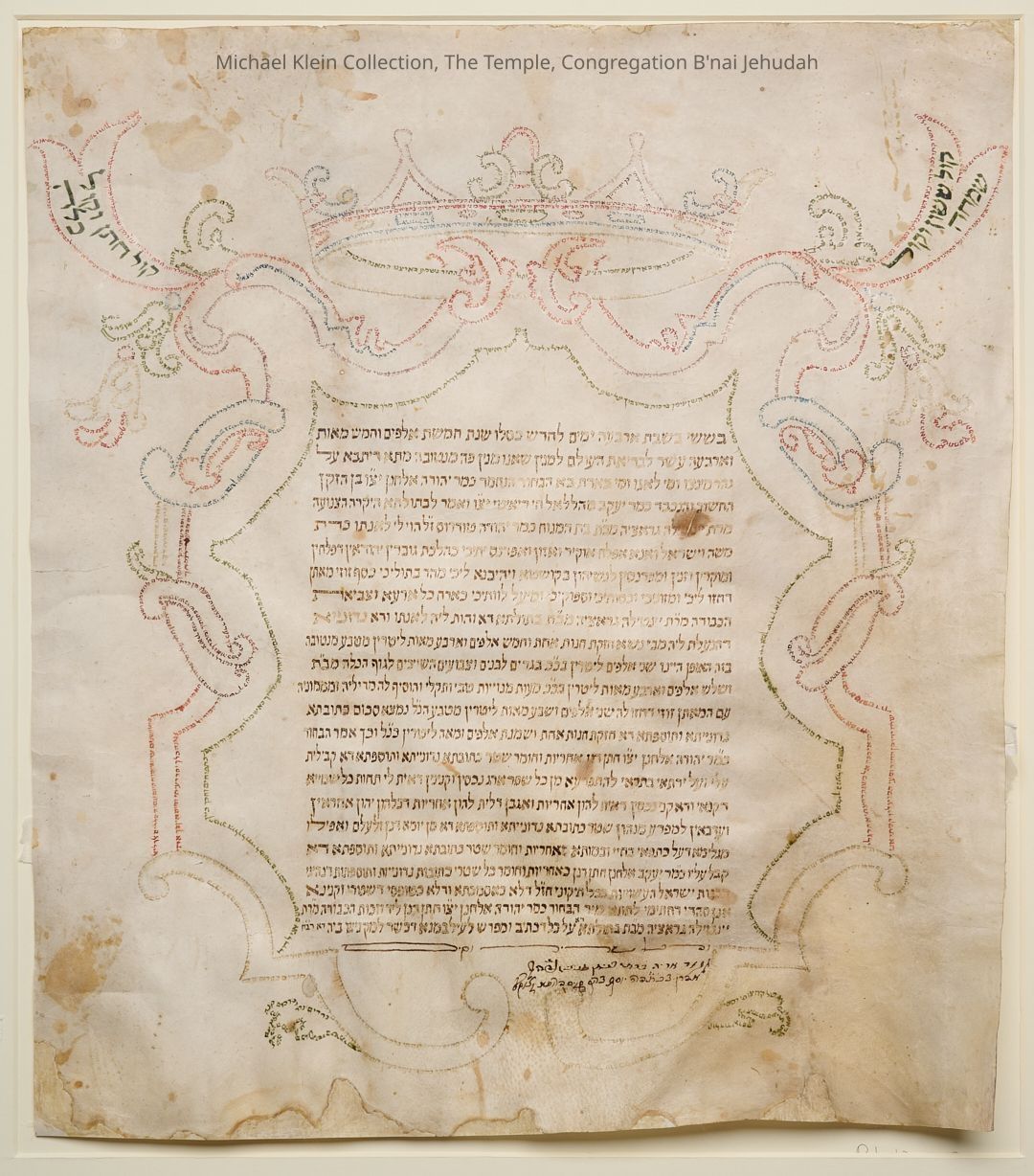 4th Kislev, 5514 (November 30, 1753). Ketubah on rectangular parchment sheet, entirely decorated in micography composed of verses from Shir HaShirim, written alternately in three colors. At the top of the ketubah is a decoration shaped as a large crown, with two ribbons with verses of blessing on the sides. Signatures of witnesses on edges: Gur Ayeh son of Binyamin Finzi and Aharon son of Yosef Baruch Cases the physician (rabbis of Mantua). For similar ketubot from Modena, see Sabar (2022), vol. I, nos. 15-16; Kedem Auction 101 17 February 2025, lot 17.Made/Created
