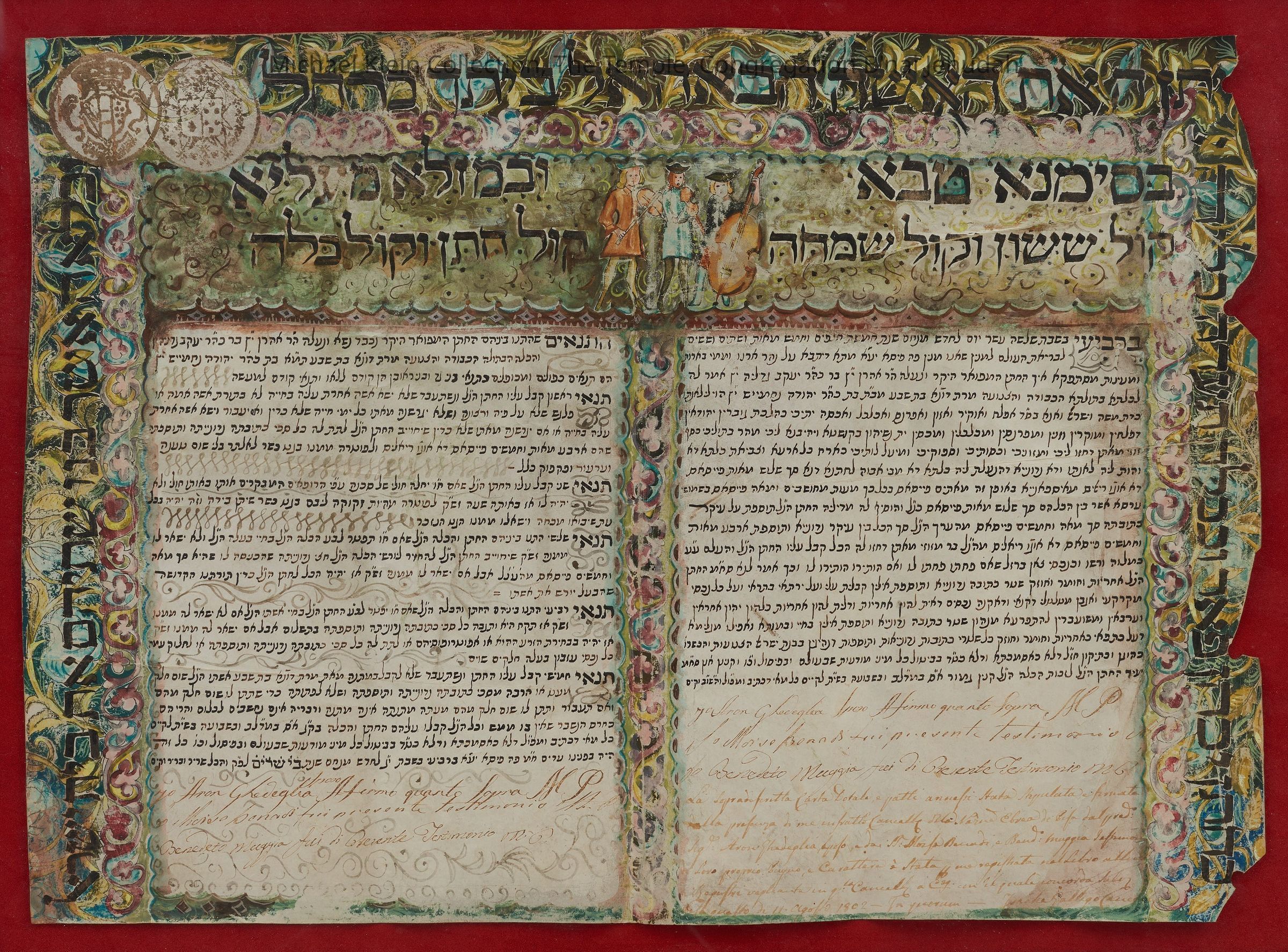 Mehachem Av 4, 5562 (1802). On parchment. Decorated with a double frame with rich floral designs. Composed of the tenaim (left side) and the ketubah (right side). There were 300 Jews in Pisa during the 18th century. Later decorated and illuminated.Made/Created
