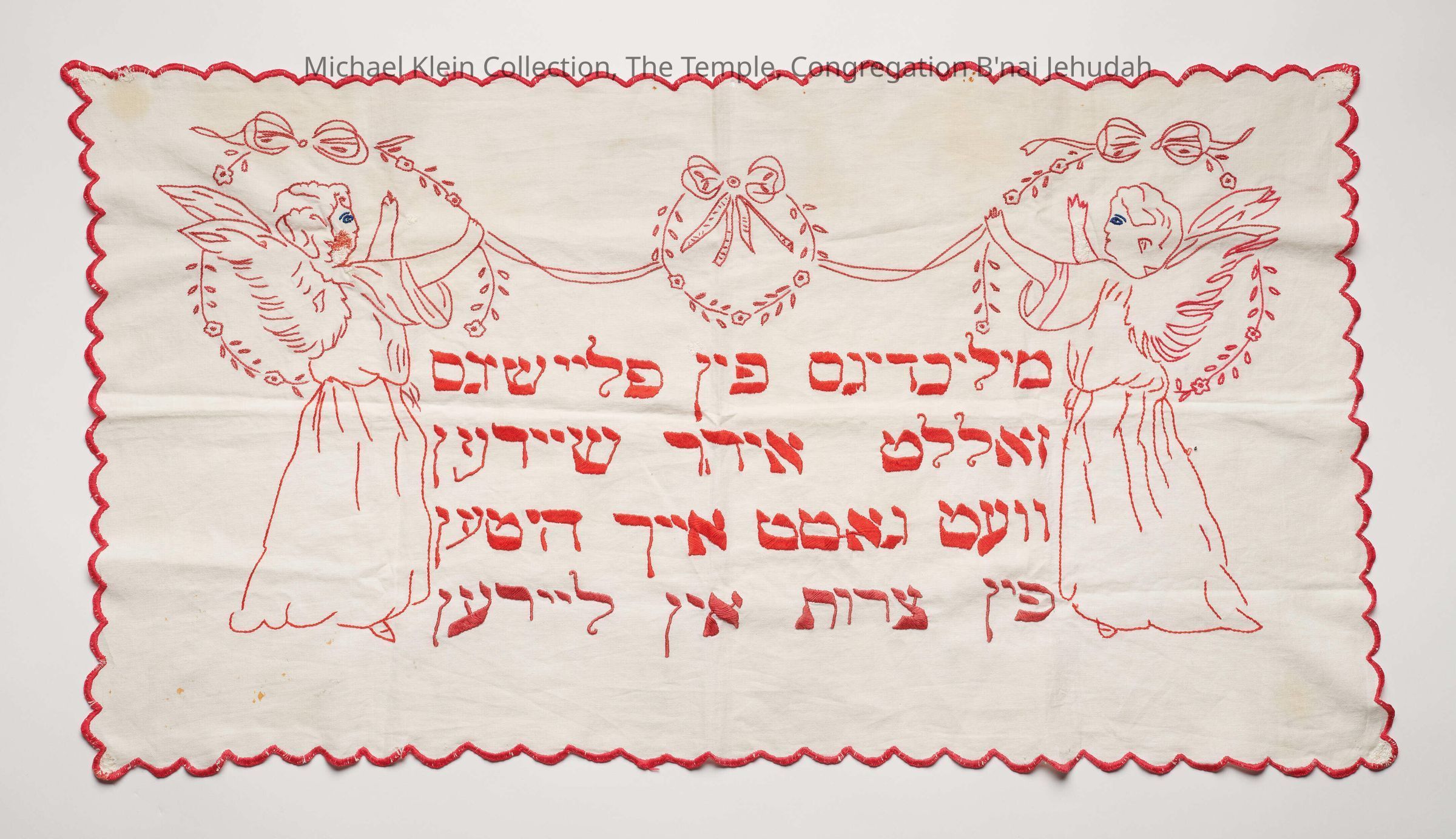 Angels on right and left, yiddish inscription in center. Red embroidery. Scalloped edge. From the kitchen of a Jewish institution. "Keep a distance from meat and milk and God will keep you from trouble and suffering."Made/Created