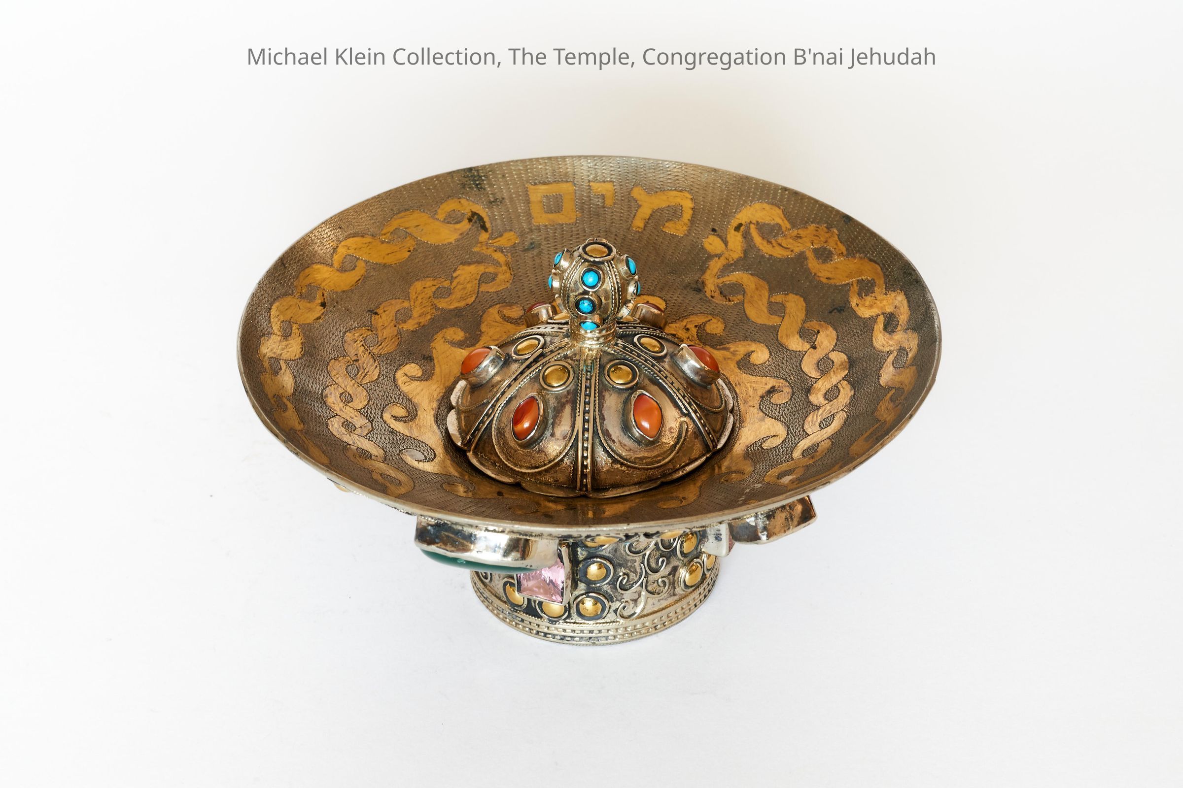 Filigree ornaments on parcel gilt motifs with "last waters" inscription in Hebrew on basin. Hebrew, "mayim achronim," or "last waters." For hand-washing after a meal.Made/Created
