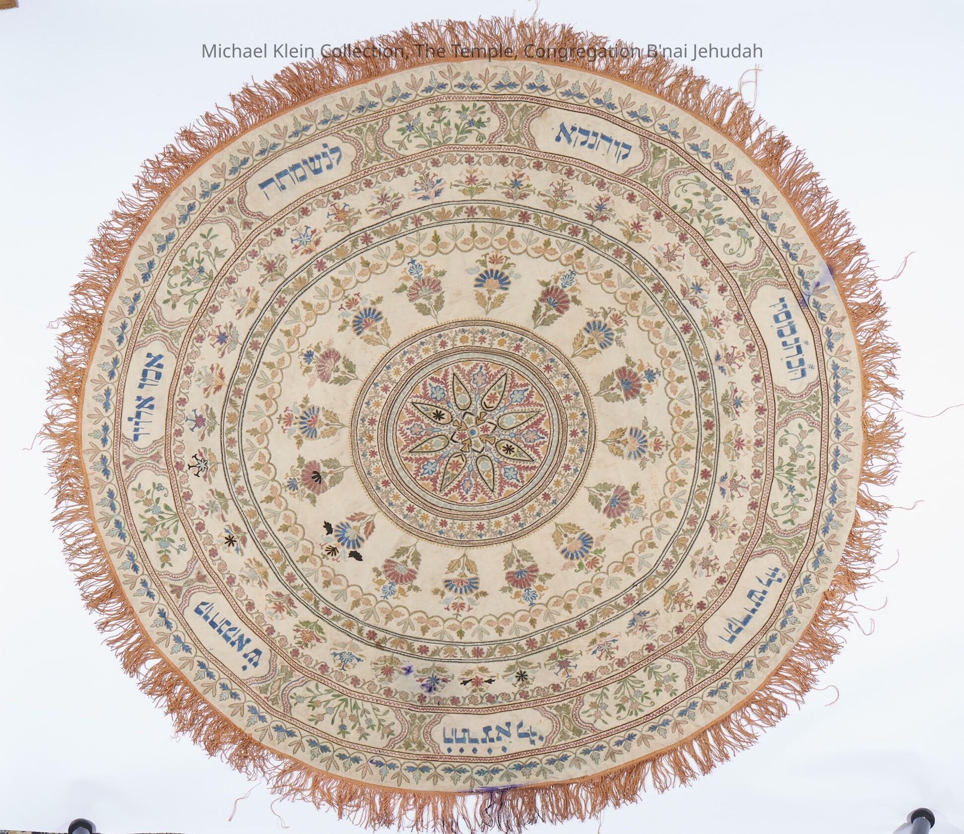 "A round cloth is set between the staves on which the Torah finials are mounted and is called malbush (Hebrew for garment) by the elders of the community. This custom was unique to Afghanistan and eastern Persia, and is familiar to us only from one other community, that of Yemen, where the cloth was known as a talith, a name whose Hebrew literal significance parallels that of the Afghan malbush. A study comparing the Afghan malbush to the Yemenite talith suggests that the malbush is a remnant of a more ancient custom which is no longer practiced in other communities. The malbush is a round cloth of costly fabric, bordered with a strip of tassels.