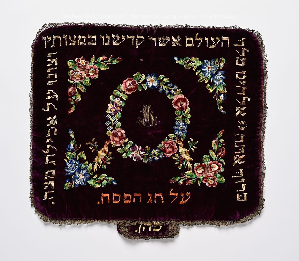 Square textile comprised of three titled sections, uppermost featuring the Hebrew blessing for eating Matzah. With Kohen, Levi Yisrael tabs.