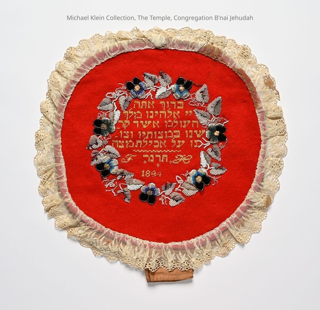 Circular textile comprised of three sections, uppermost featuring the Hebrew blessing for eating Matzah. Skirted with elegant lace trim. Dated 1894.