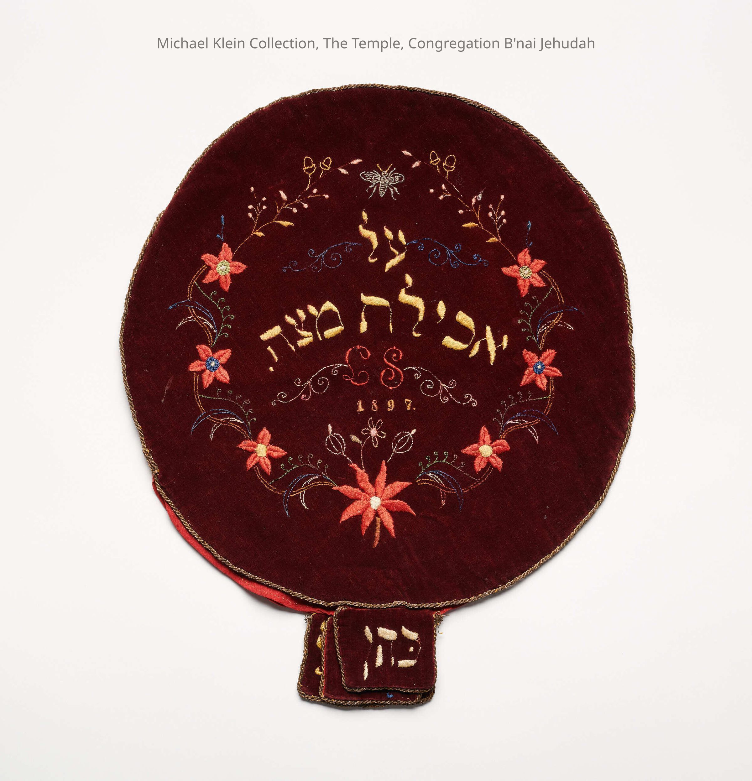 Hand embroidered red velvet with embroidered inscription, "On eating matzah," "Cohen," "Levy," "Israel," Initials: "L.S." Traditional three layers for three pieces of matzah.Made/Created