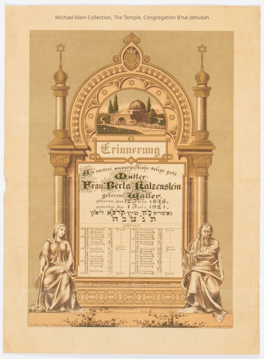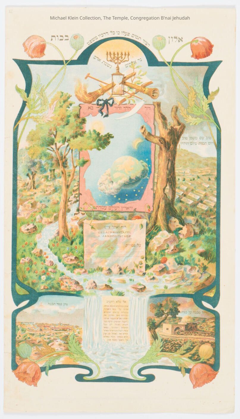 Two prints; 1: Memorial/yahrzeit print by Kohn & Co., Cologne Germany. Rachel's tomb with Star of David. Filled out for woman in 1921. 2: "Alon Bakut" color print from Israel? 19-1/2" h x 11-3/4" w. Globe with garden of Eden, Rachel's Tomb and Jerusalem prayer.Made/Created