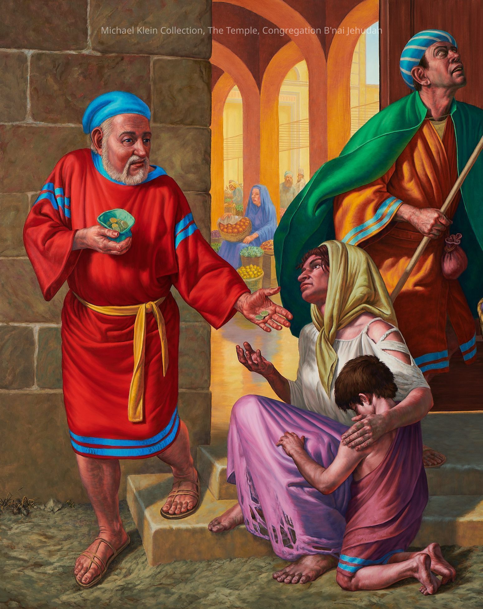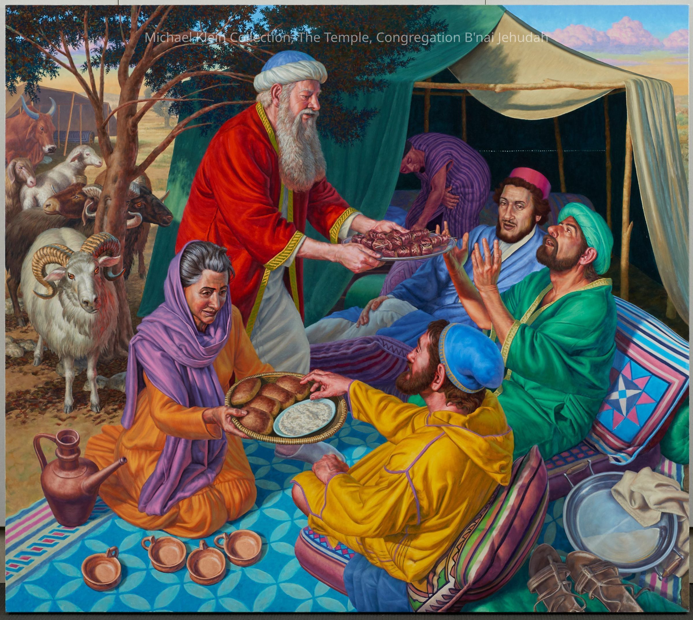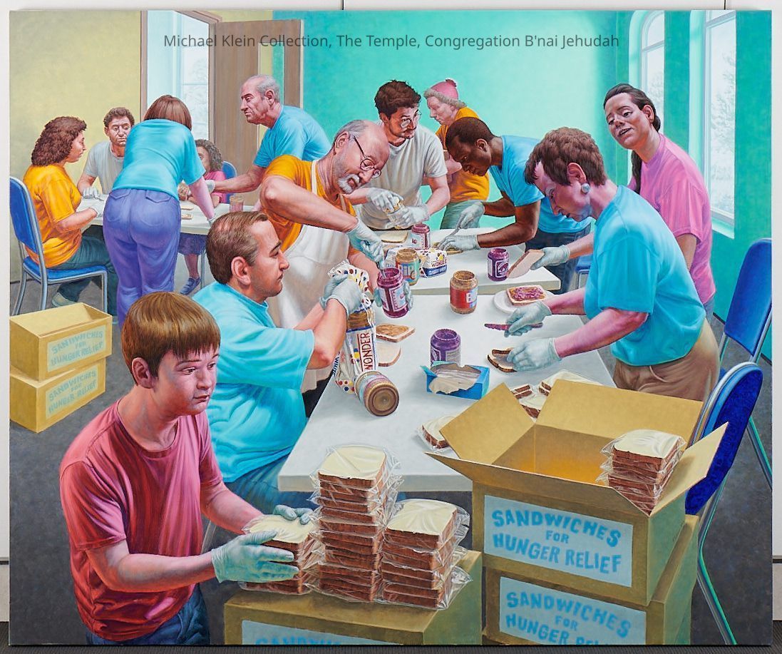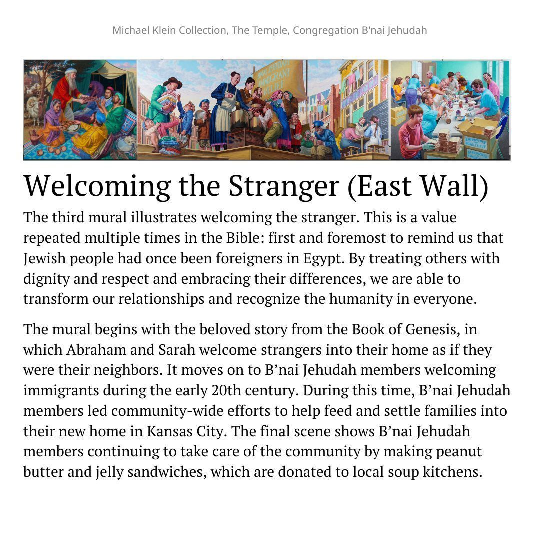 Eight canvases that share the story of Judaism and the community service throughout the ages. The first one on each wall shows a biblical time, the one in the middle shows more recent times, and the end of each wall shows present day Jewish people continuing the community service acts.Made/Created