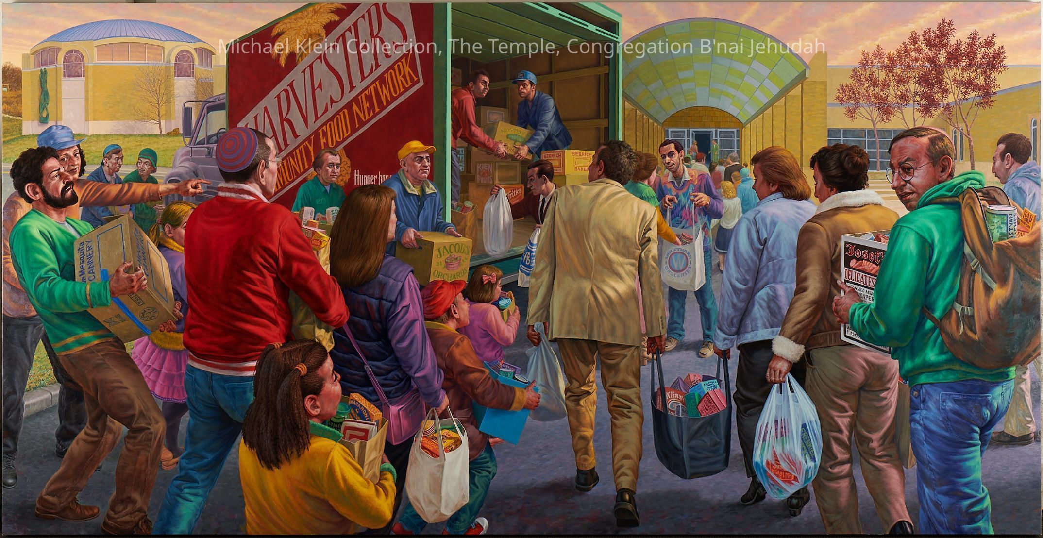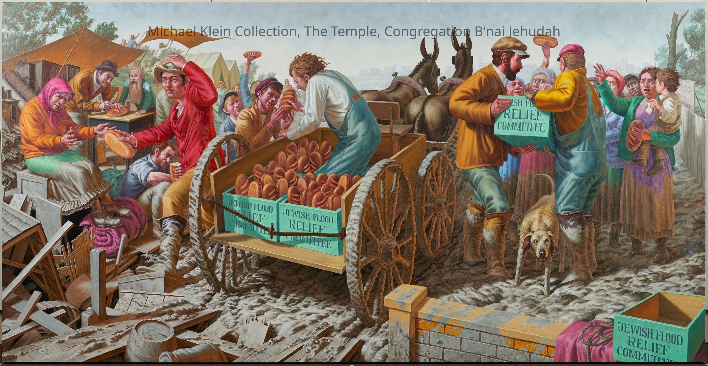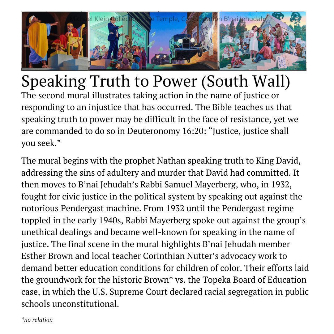 Eight canvases that share the story of Judaism and the community service throughout the ages. The first one on each wall shows a biblical time, the one in the middle shows more recent times, and the end of each wall shows present day Jewish people continuing the community service acts.Made/Created