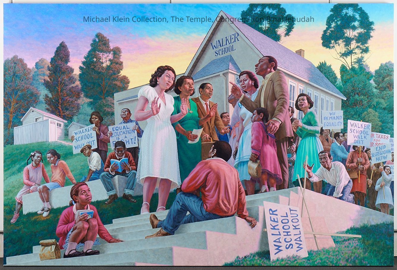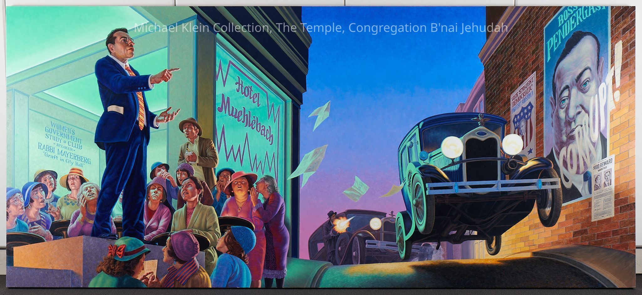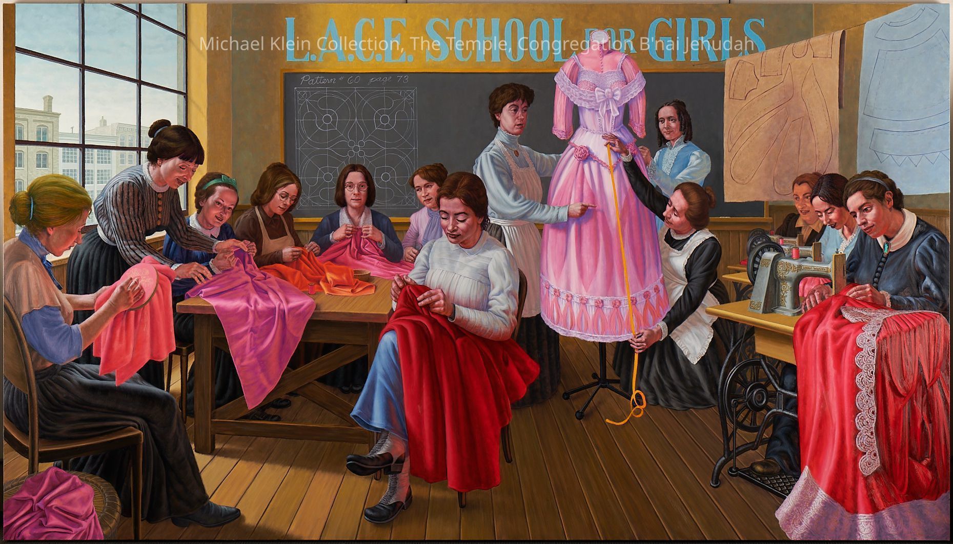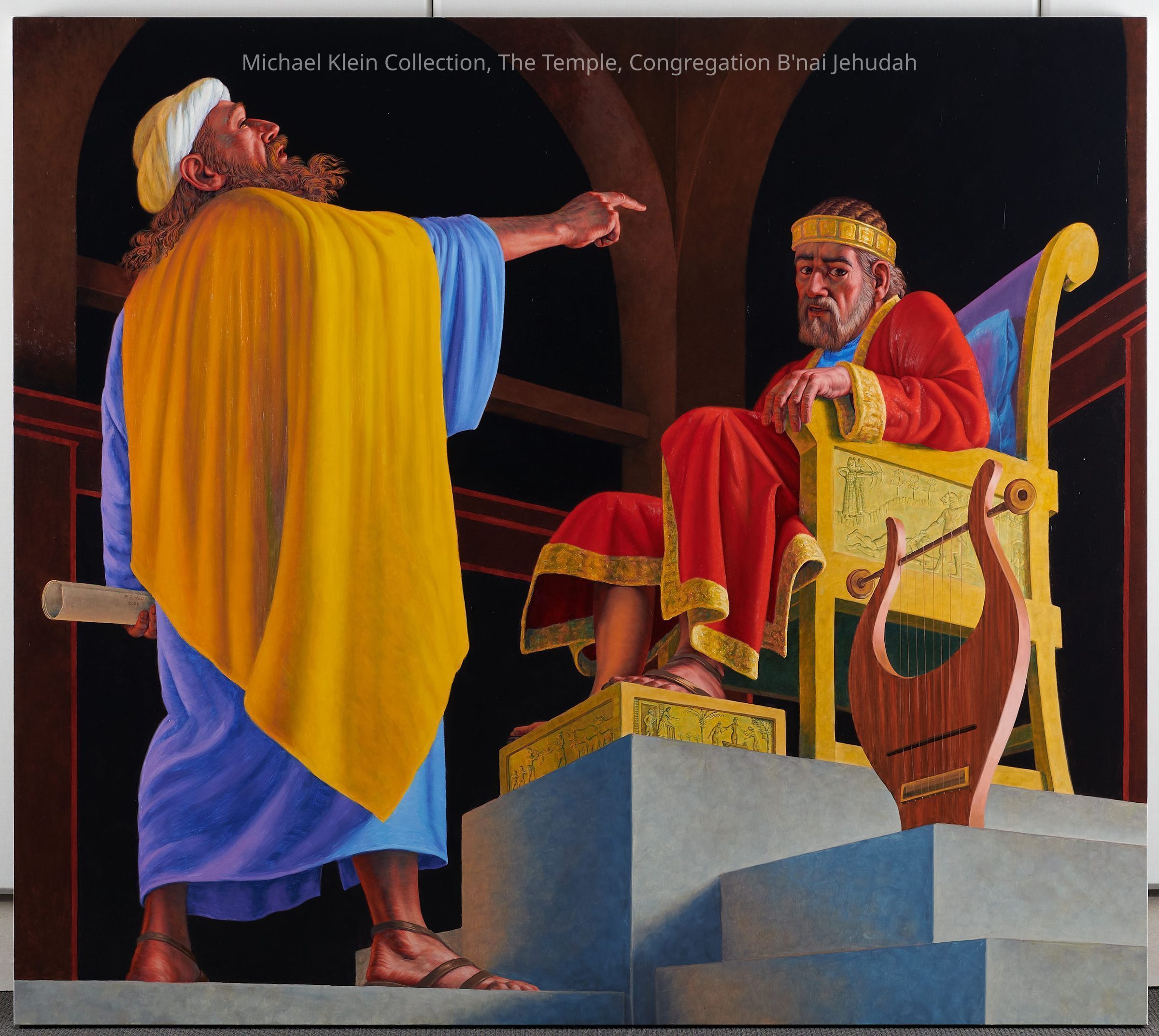 Eight canvases that share the story of Judaism and the community service throughout the ages. The first one on each wall shows a biblical time, the one in the middle shows more recent times, and the end of each wall shows present day Jewish people continuing the community service acts.Made/Created