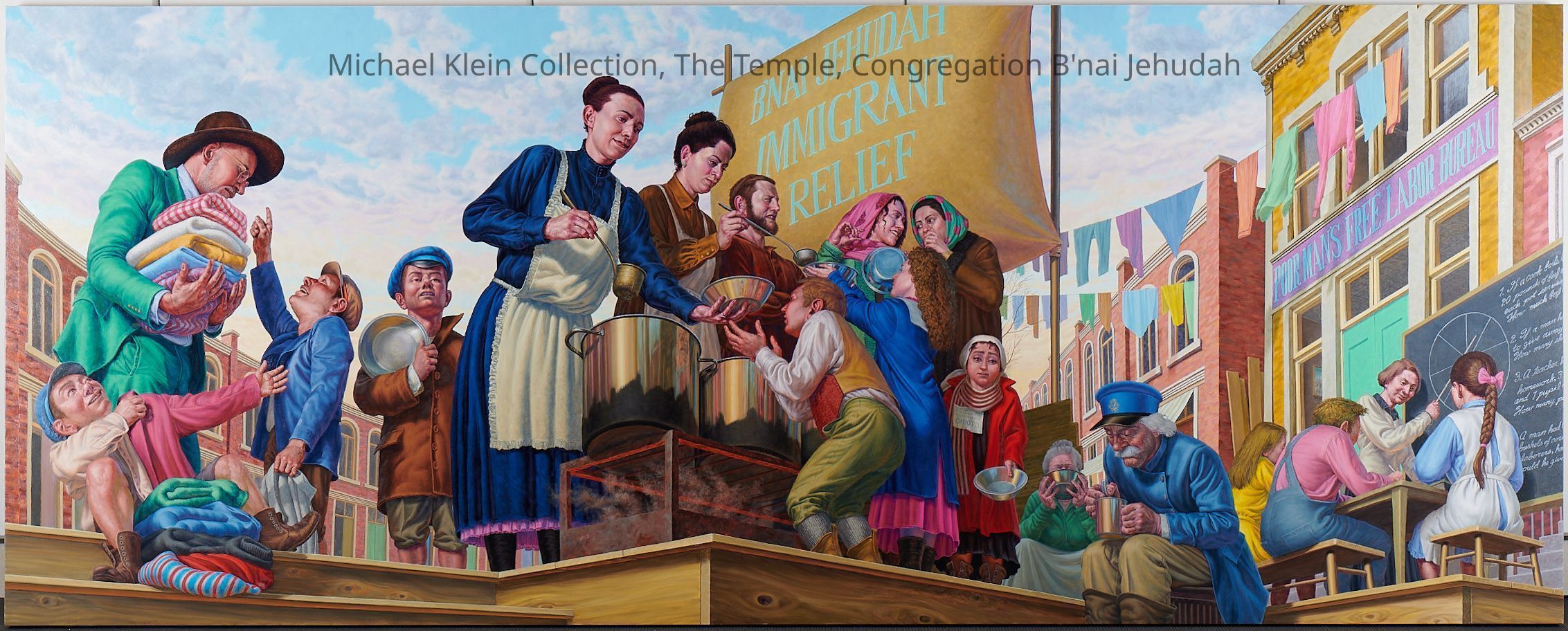 Immigrants:161"b X 64"h X 2.5"w; sandwiches: 77"b X 64"h X 2.5"w; biblical Nathan and David: 72"b X 64"h X 2.5"w; Mayerberg: 143"b X 64"h X 2.5"w; Ester Brown: 85"b X 64"h X 2.5"w; Abraham and Sara: 72"b X 64"h X 2.5"w; LACE: 113"b X 64"h X 2.5"w; Food Drive: 125"b X 64"h X 2.5"w;