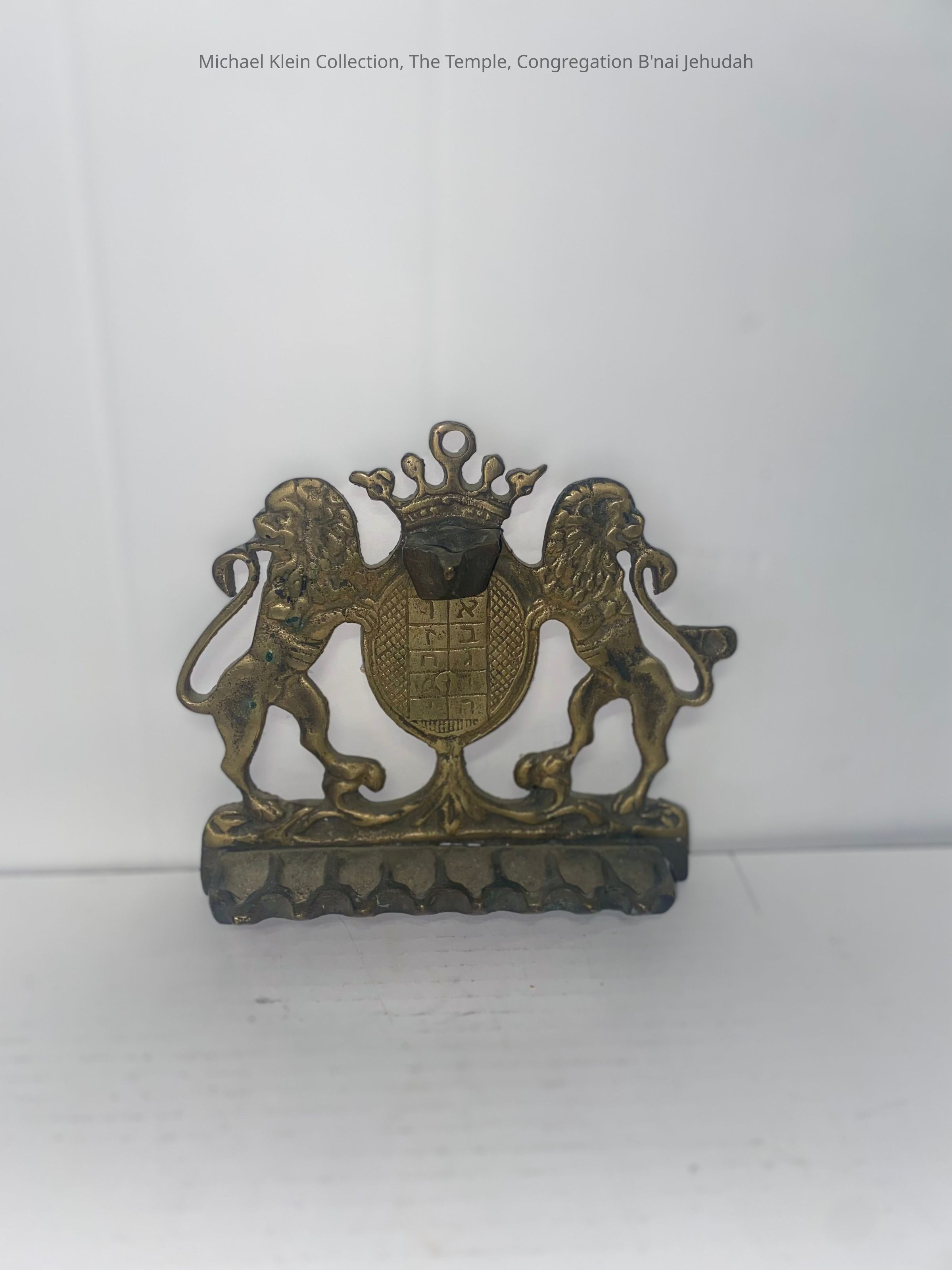 Hanging menorah with images of rampent lions, the ten commandments and a crown on the top.