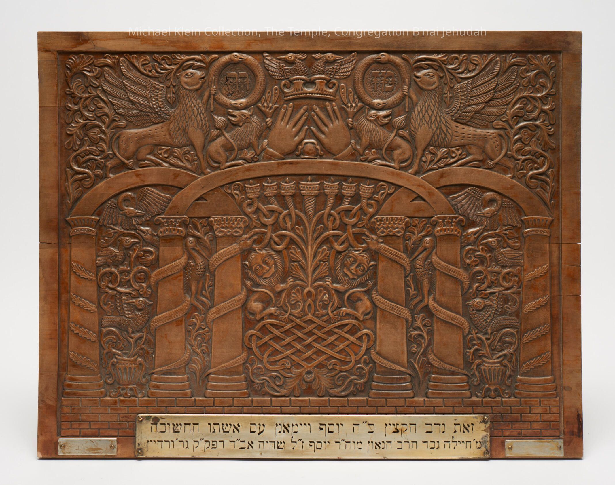 Mizrach - an extremely rare wood panel, richly carved with lions, birds, flowing scrolling foliage, columns with coiling snakes, priestly hands, and a central menorah - all stylized in the best manner of East European Jewish Folk Art. The lower part applied with silver plaque finely cut-out with Hebrew dedicatory inscription indication that this panel was the donation of Joseph Weimann and his wife, the Lady Chayale, the granddaughter (?) of the Rabbi, the Gaon (of blessed memory) Joseph the Ab Beth Din of the Holy Congregation Grosswardein (Nagy-Varad or Oradea Mare, now part of Romania). The hallmarks on this plaque are from Austria/Hungary, 1868-1872, although the Mizrach is much earlier. Grosswardein is a large city in Western Transylvania (previously Hungary) with no tradition of Jewish folk art, therefore the Mizrach probably originated in Ukraine or Buchovina (North Eastern Romania), where there was a rich history of synagogue art in exactly this manner of decoration. In our opinion this Mizrach was made 1800-1840, acquired in Eastern Europe and re-dedicated circa 1870. Crafted in the Ukrainian/Polish tradition, this very important and rare wood Mizrach is iconic in its rich decorative elements, and typical of the very best of Jewish folk art.Made/Created