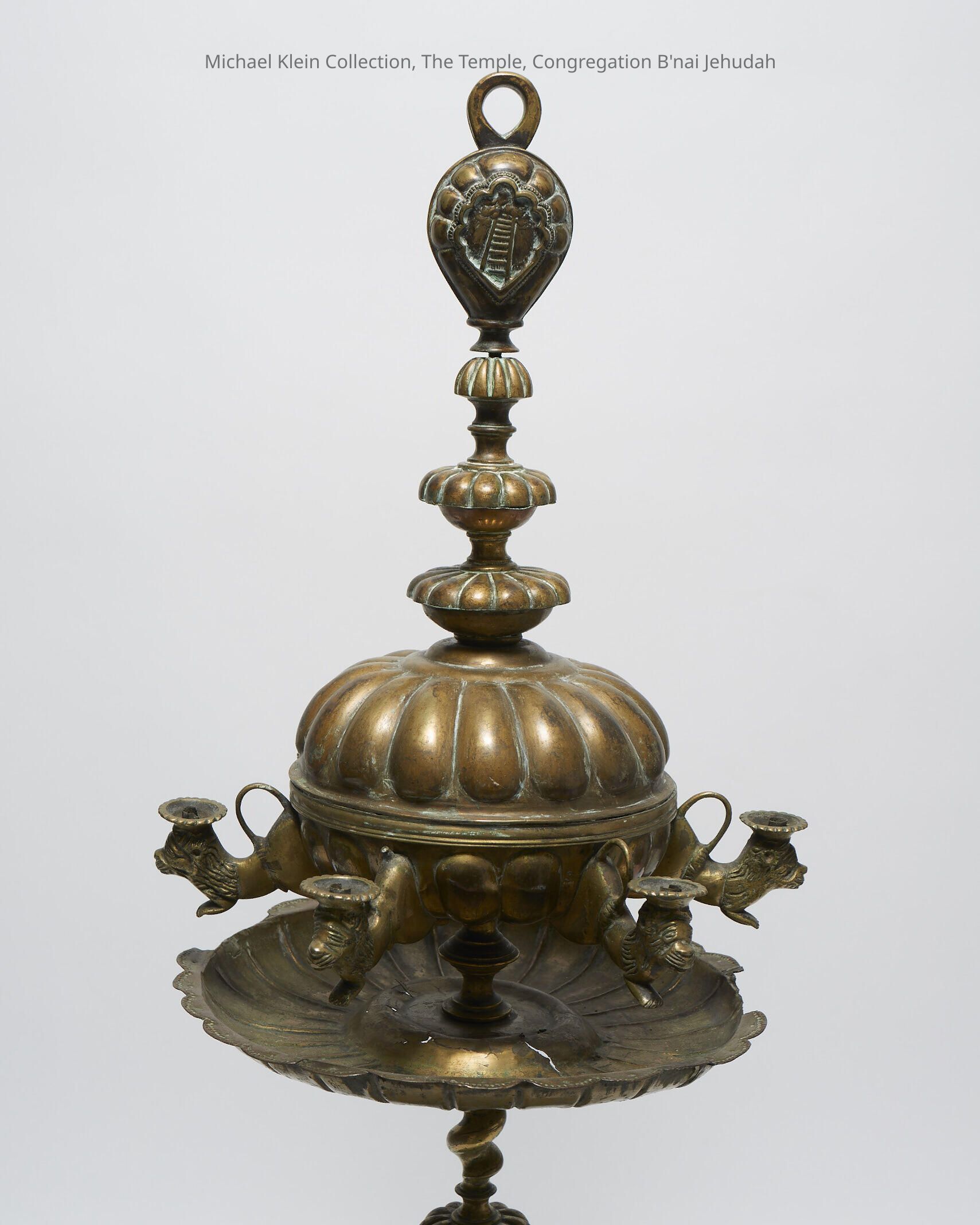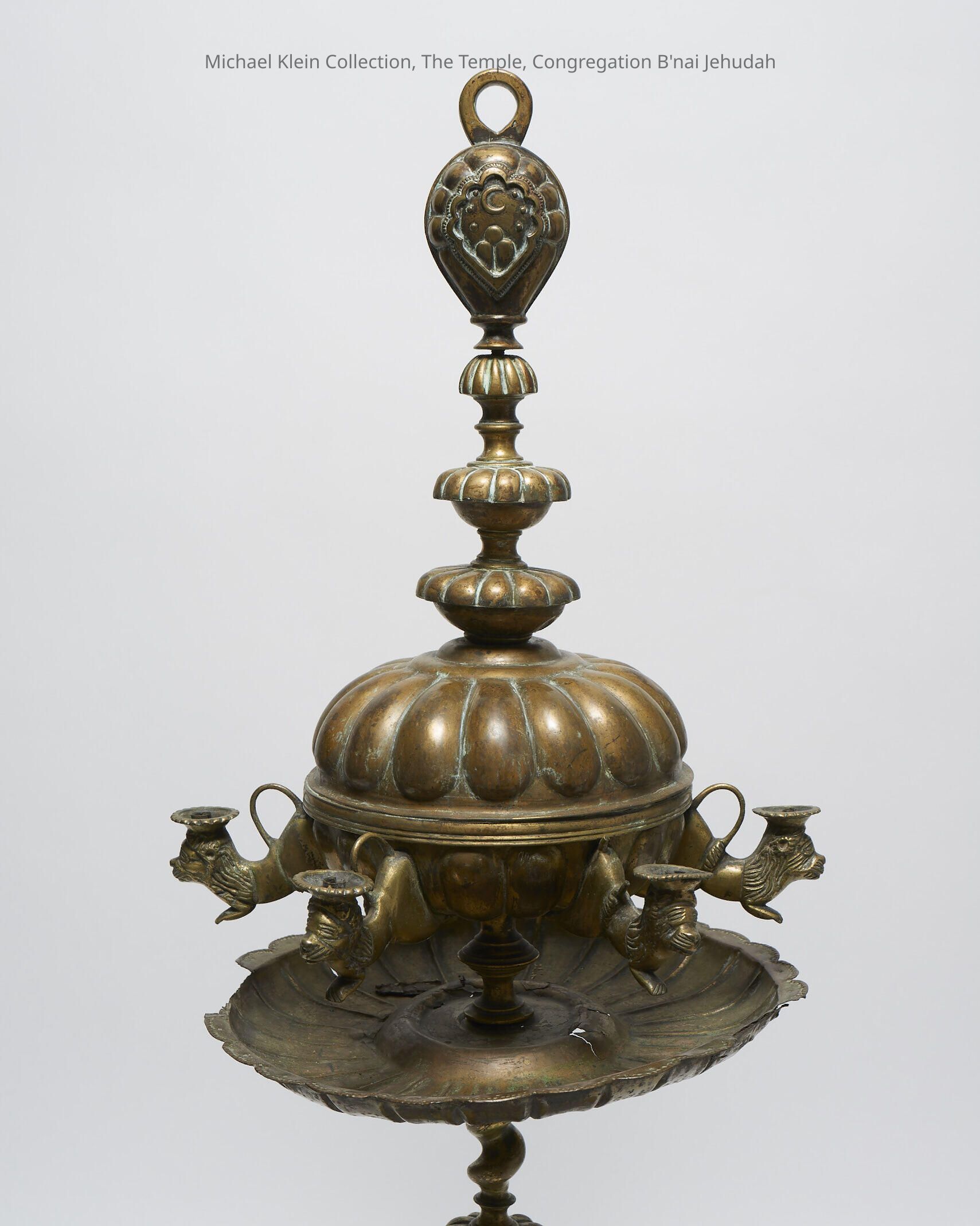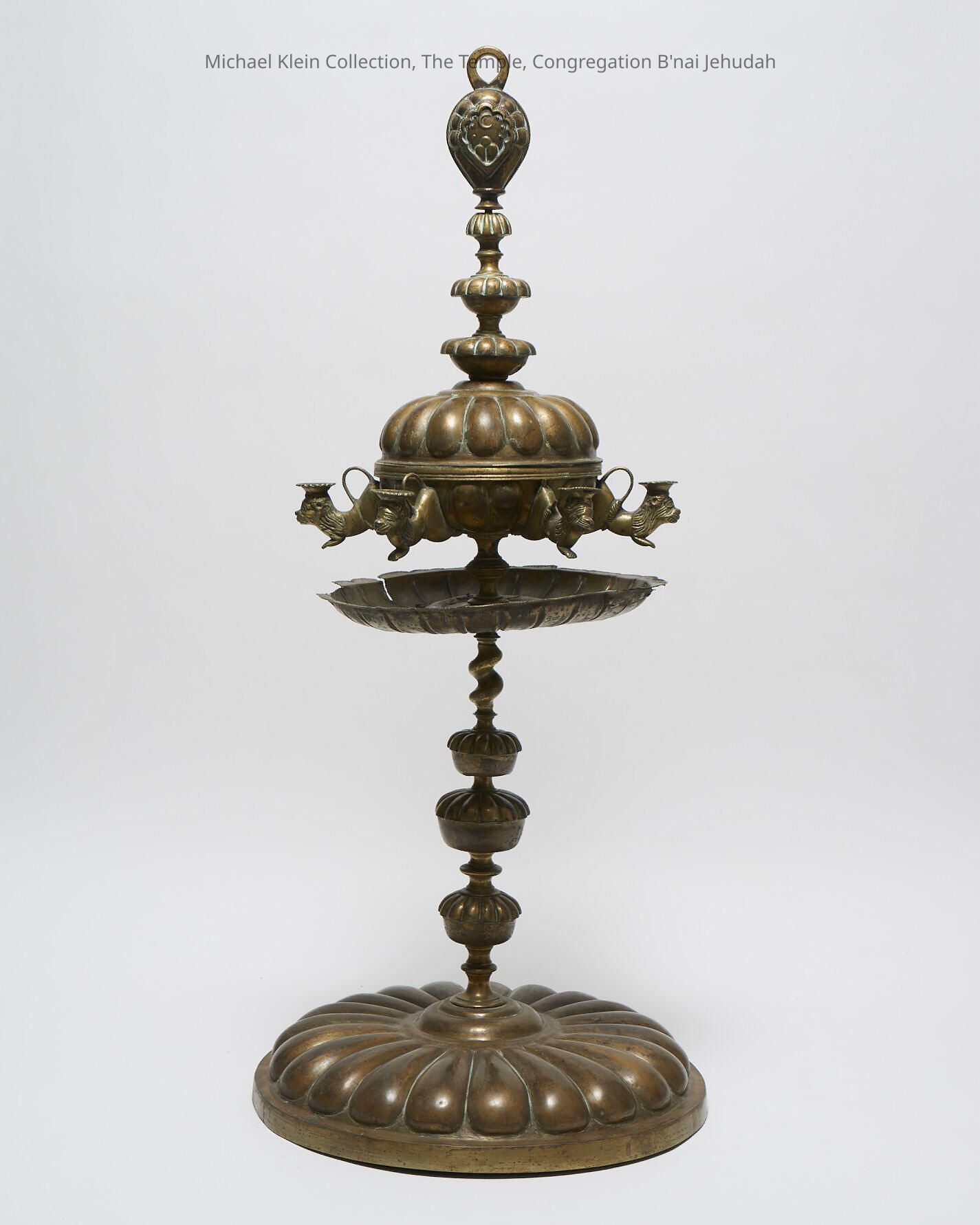 Finial carved with family crests: Sulam, Delmonte. Because it has both family crests it was likely a wedding present. Brass is hand-wrought and hammered. Six lion-shaped oil receptacles. Most likely used as a "Sabbath Light."Made/Created