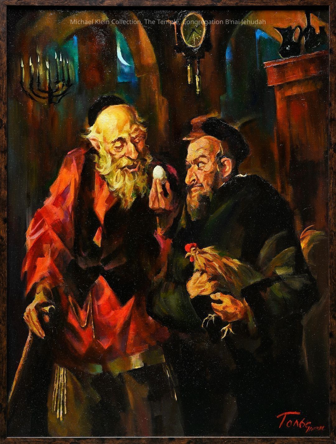 Chicken and egg - Halachic debate. Misattributed to Herman Gold at auction; revealed by artist to be a forgery