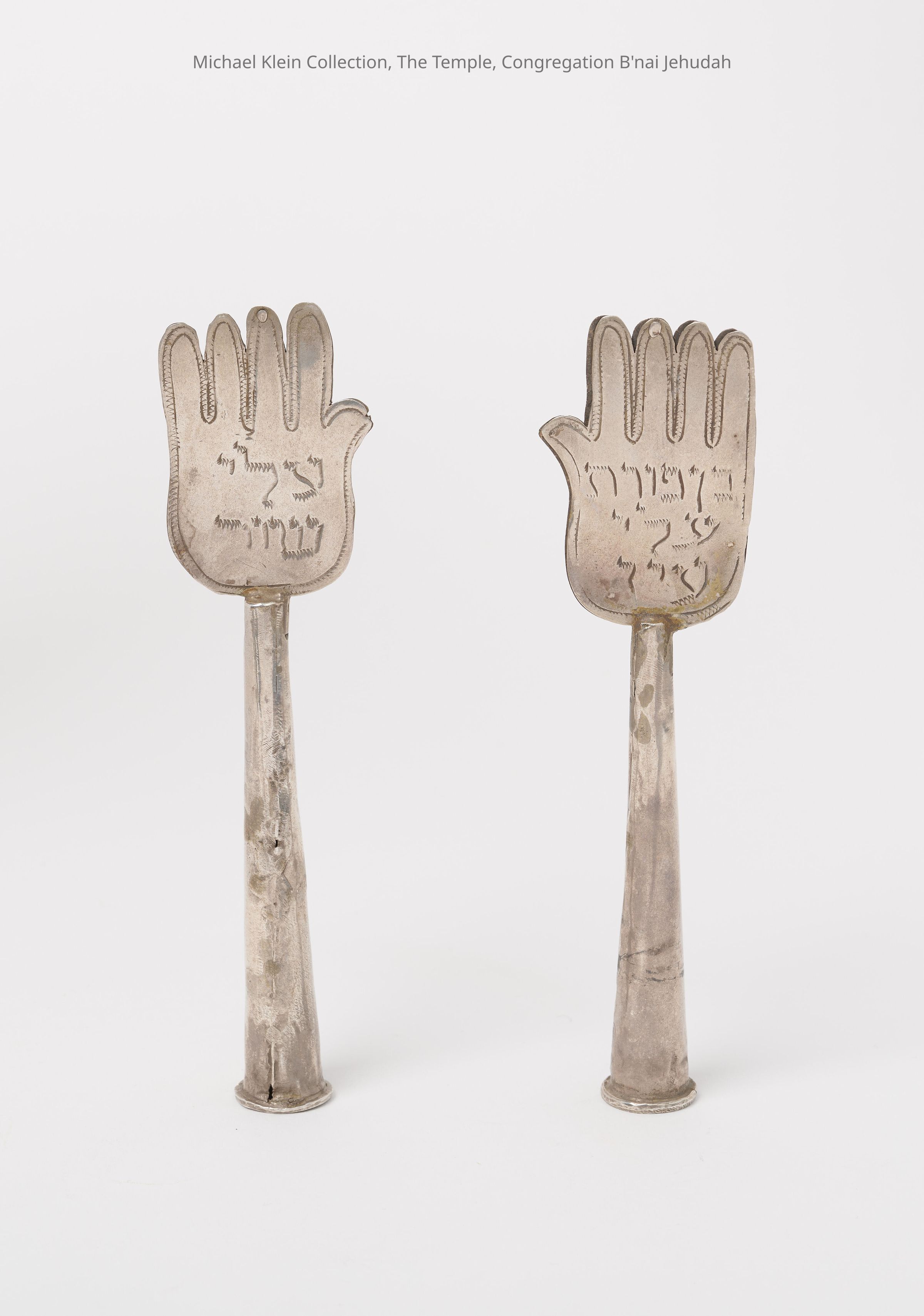 Topped with hamsa-style hands. Engraved with the Kabbalistic Hebrew inscriptions "Ali Shir" and "Ben Porat Alie Ayin." Very rare.Made/Created