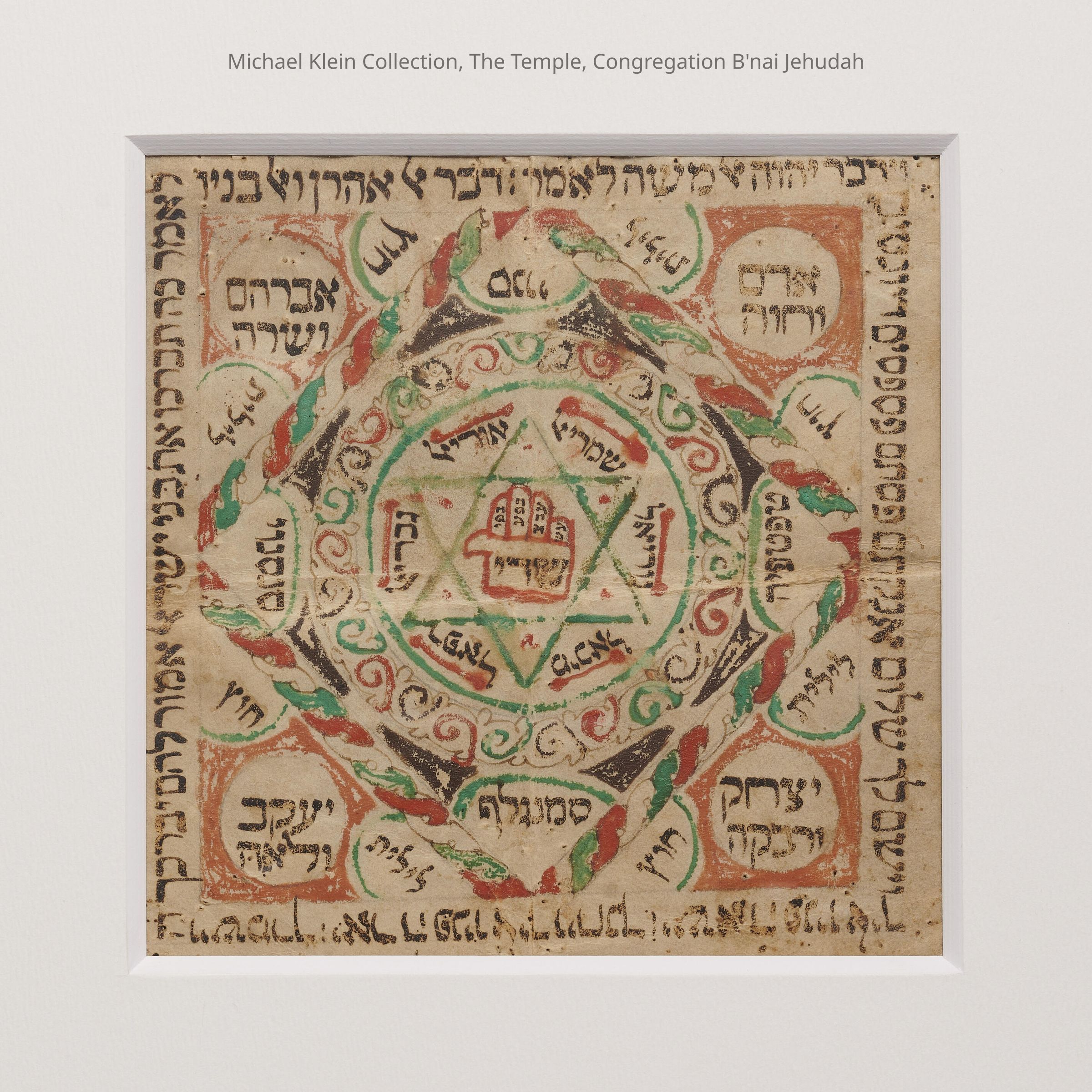 Decorated protective amulet on parchment. Brownish-black ink; green and red paint (which, in combination with the white unpainted section, resemble the colors of the Italian flag) on a square piece of parchment. The center exhibits a hamsa with a Star of David surrounded by a patterned circle enclosed within a square. The names of ten angels are written inside the circle and in the corners of the square. The phrase "Lilith Chutz [Lilith be gone]" is written along each side of the square. THe outer amulet frame contains verses from the Priestly Blessing and the 22-letter Holy Name, with the names of the patriarchs and matriarchs written in the four corners: Adam and Eve, Abraham and Sara, Isaac and Rebecca, and Jacob and Leah. The shape and format of this amulet are consistent with amulets produced in the 17th and 18th centuries in Italy, which were placed in unique silver amulet holders.Made/Created