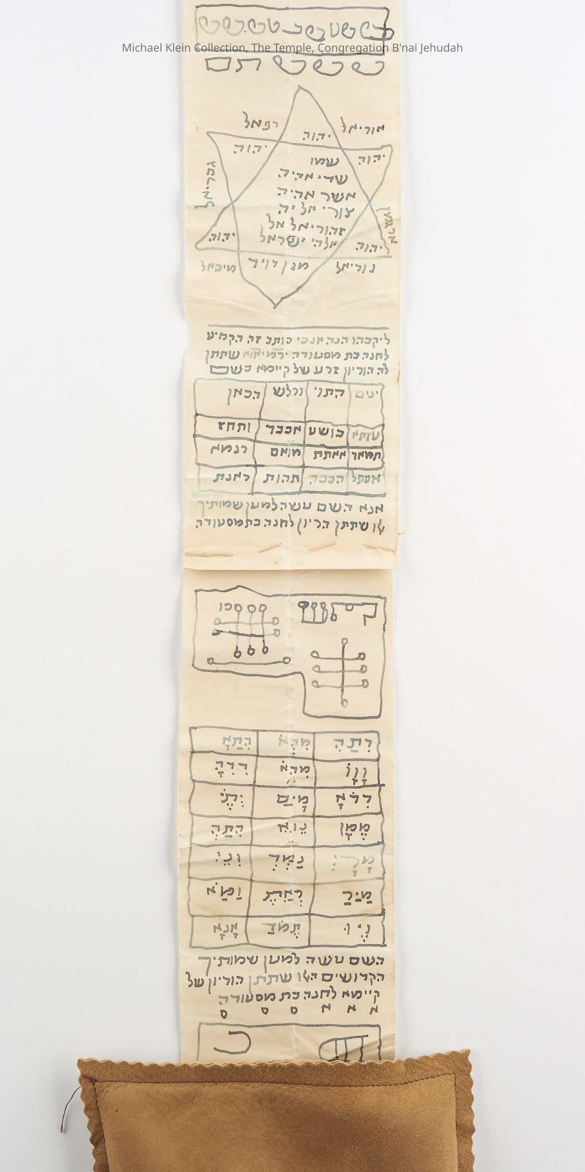 From file: "It contains almost all the kinds of illustrative devices that are found in scroll amulets, from angel writing and the use of multiple names to tables of words and abbreviations and various forms of the magen david. It is made of four pieces of paper that have been sewn together, a most unusual arrangement for scroll amulets and rarely seen. Once again, the mention of the three angels who protect mother and child from Lilith places this in the category of a birth amulet that was carried in a silver, cloth, or leather container on the person of the pregnant mother for protection."Made/Created