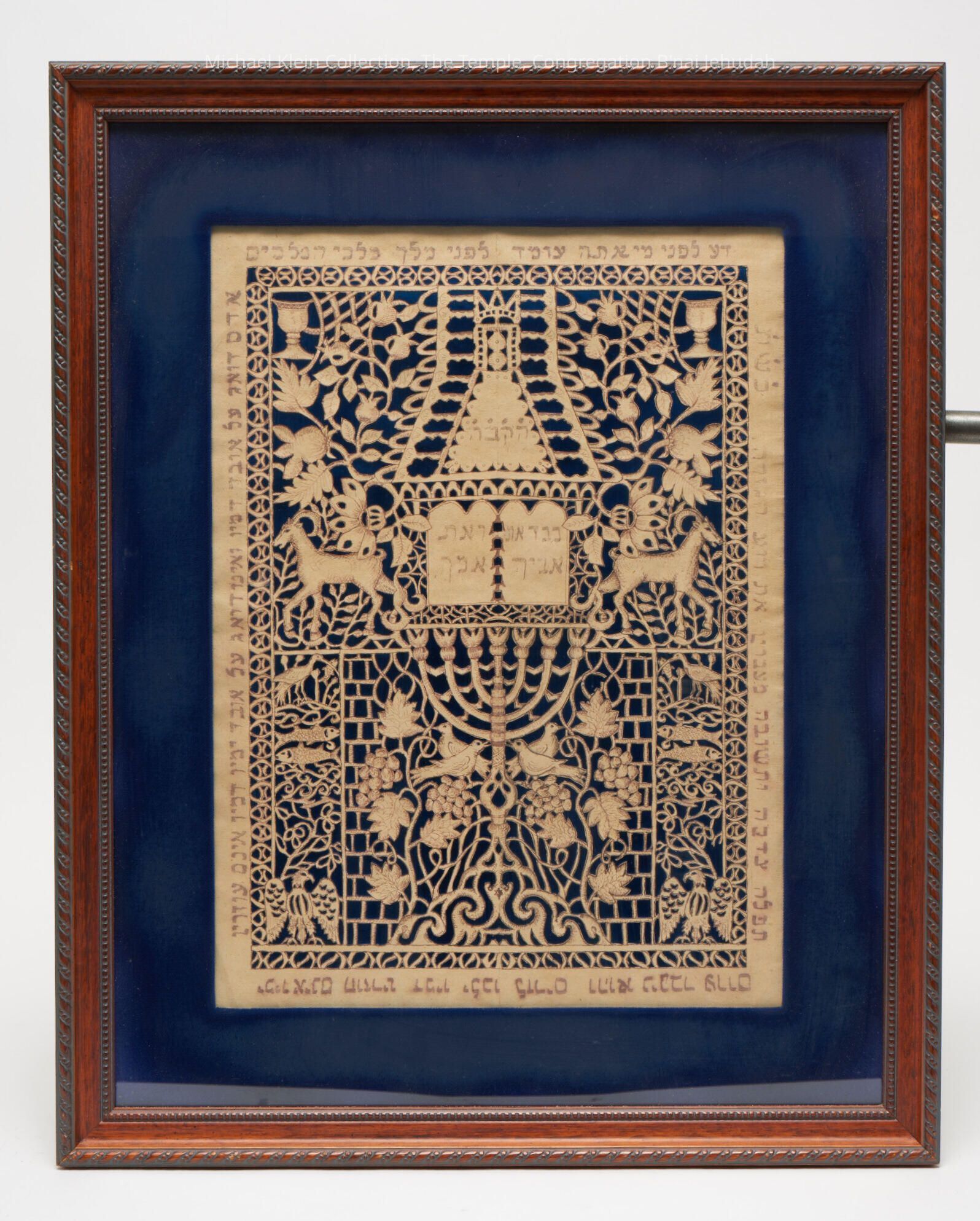 Handwritten Hebrew text relating to honoring one's parents. Menorah surrounded by birds, fish, grapes, vines.Made/Created