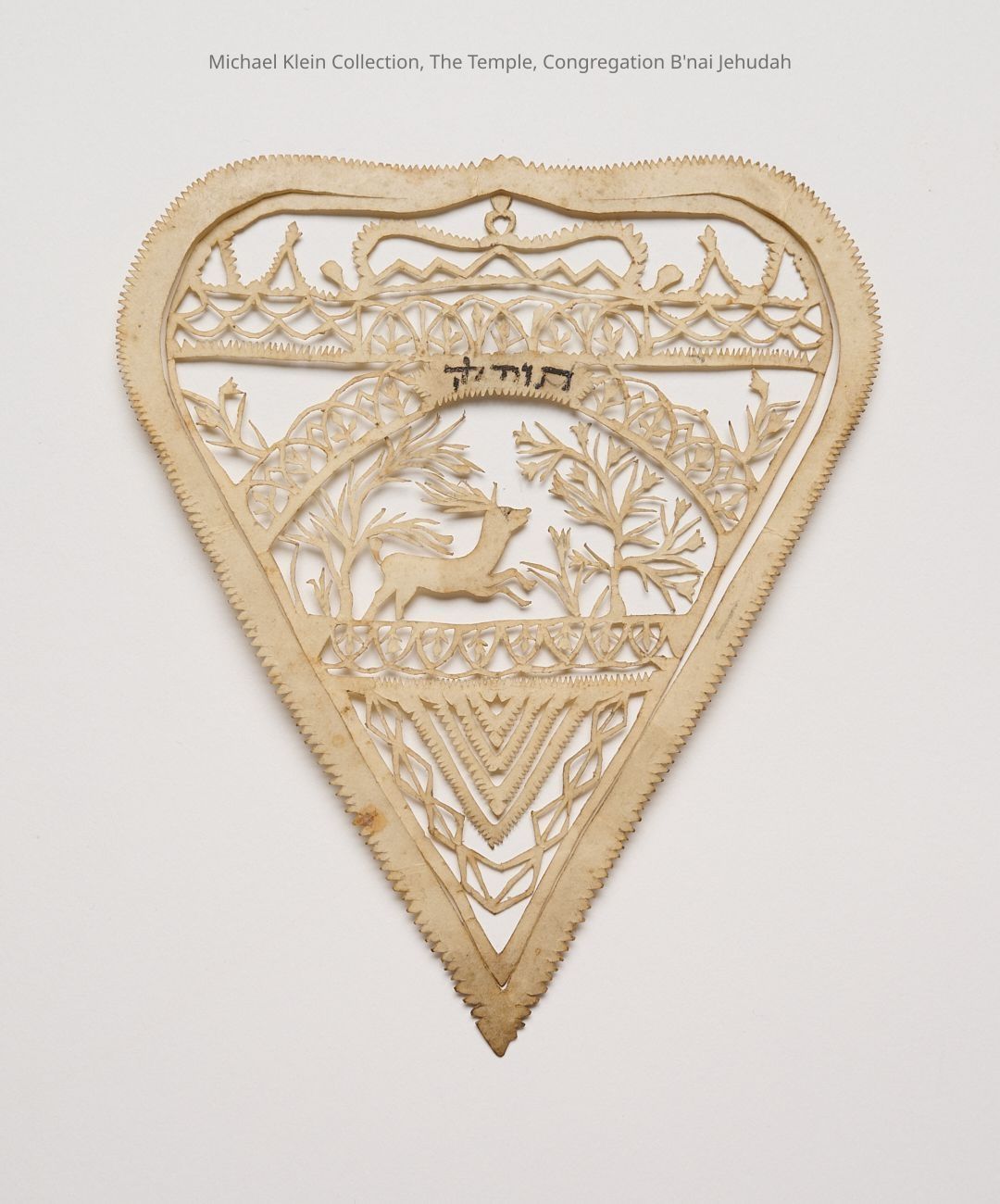 A hand-cut Jewish papercut on parchment, most likely from Germany, dating to the 18th or early 19th century. The amulet bears Hebrew inscriptions and is finely decorated with delicate cut-work motifs including a deer, a Torah crown, a flowering tree, and geometric and vegetal ornaments typical of Ashkenazi Jewish folk art of the period. The overall shape is heart-like, symbolizing love and blessing, and it was likely created as a protective amulet or ceremonial gift for a family occasion such as a birth, wedding, or redemption ritual. A refined and evocative work of art reflecting the spiritual and aesthetic world of Central European Jewish communities in the early modern era.Made/Created