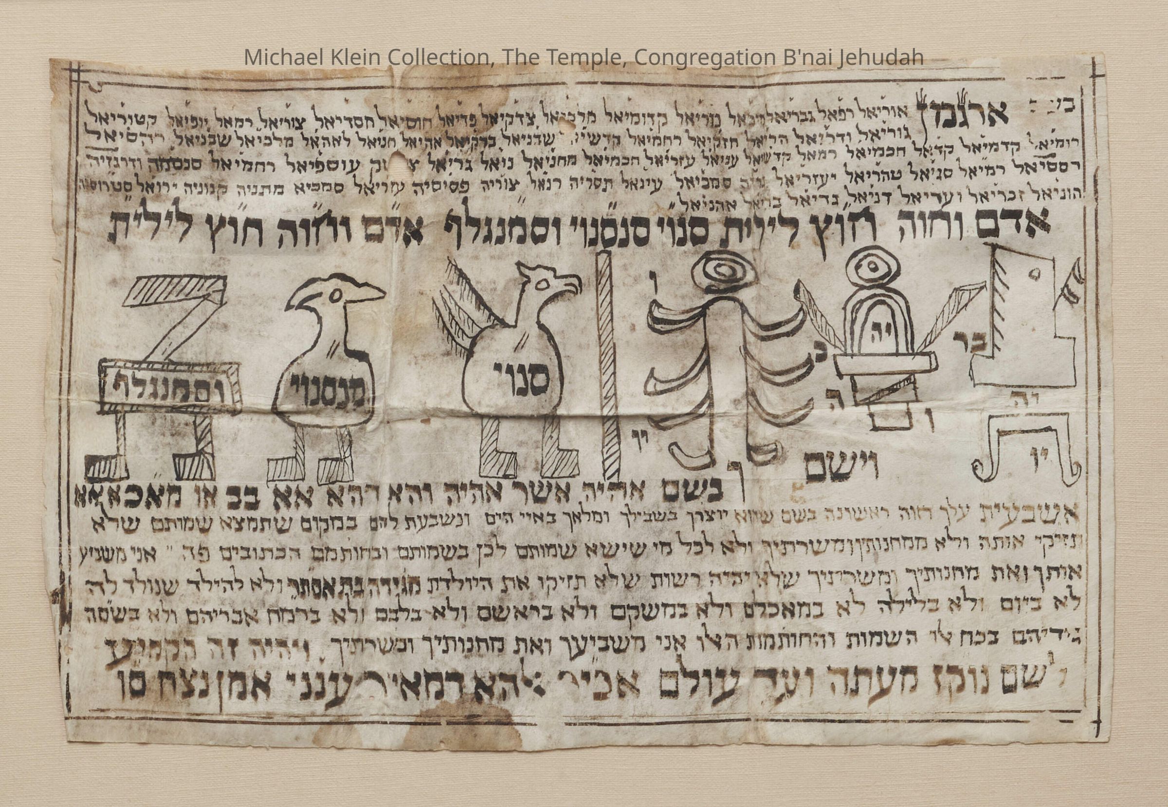 Amulet for protection of the newborn child and the new mother, "Majidah daughter of Esther," according to the kabbalistic work "Sefer Raziel HaMalakh" (Book of Raziel the Angel), with illustrations of angels that guard against the female demon Lilith. Written entirely in square script.Made/Created