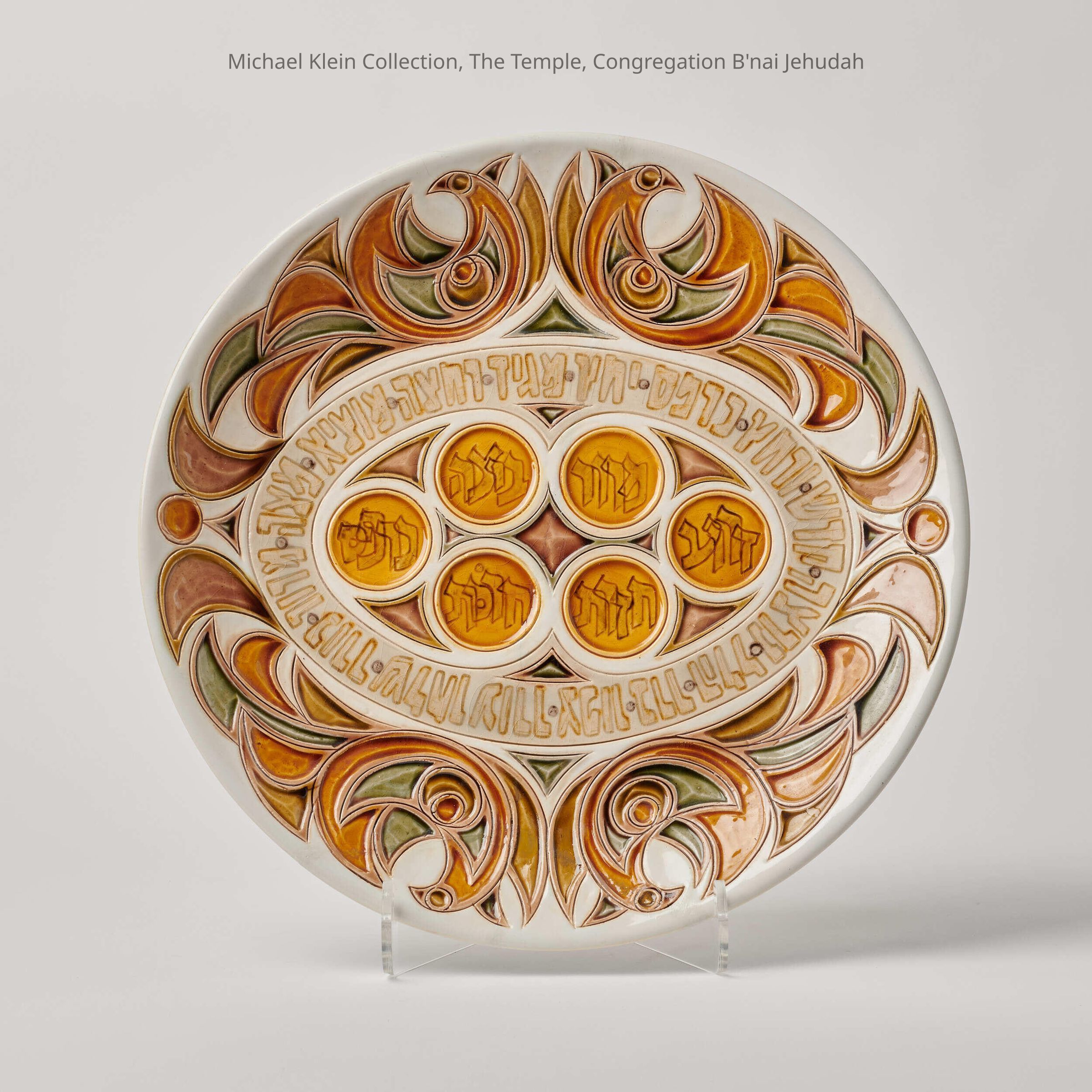 Round plate. Studio unique item. Hebrew around center for six symbolic foods.Made/Created