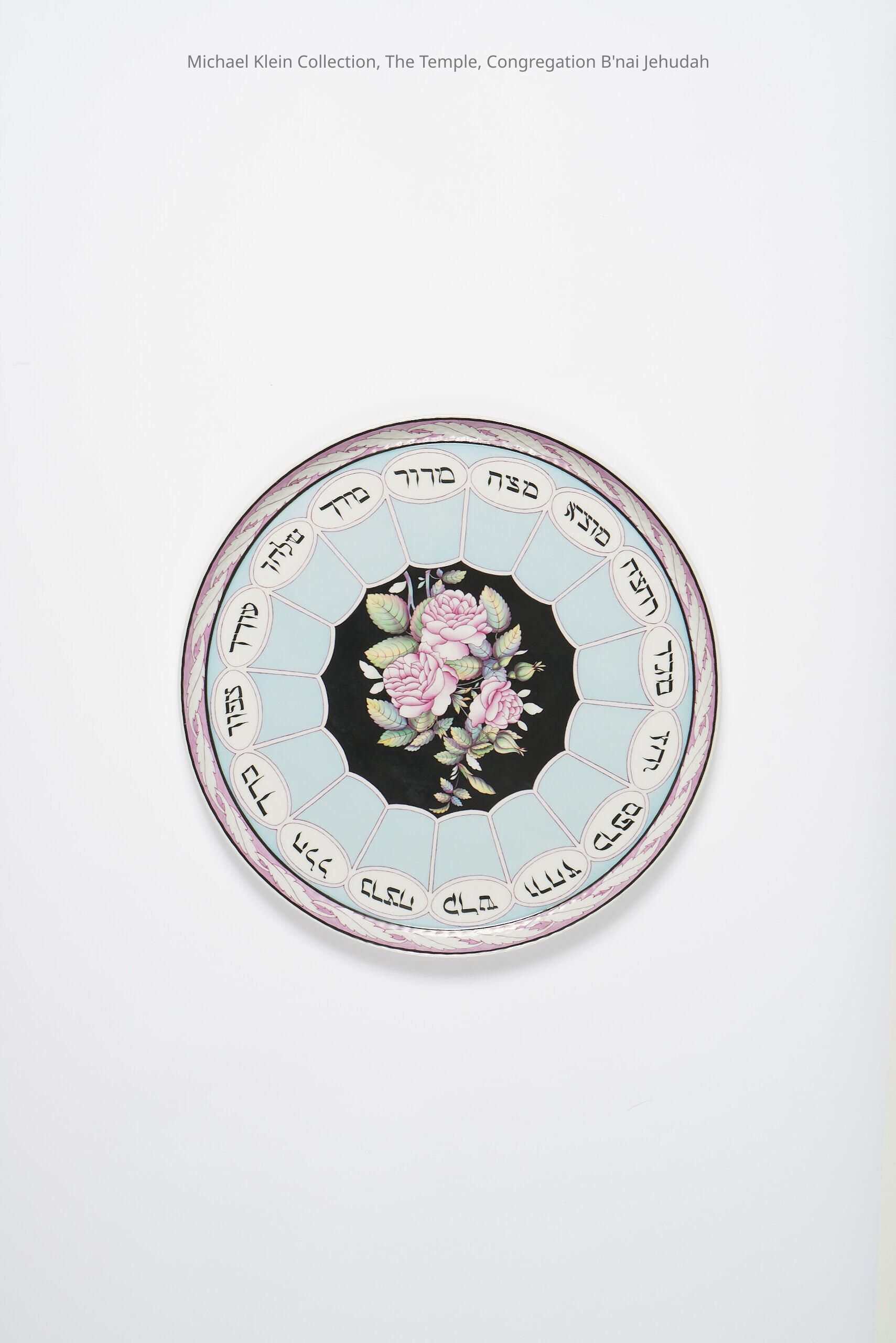 Order of Seder: 16 items. Roses in center with black background, light blue outside, pink amd white leaf border.Made/Created