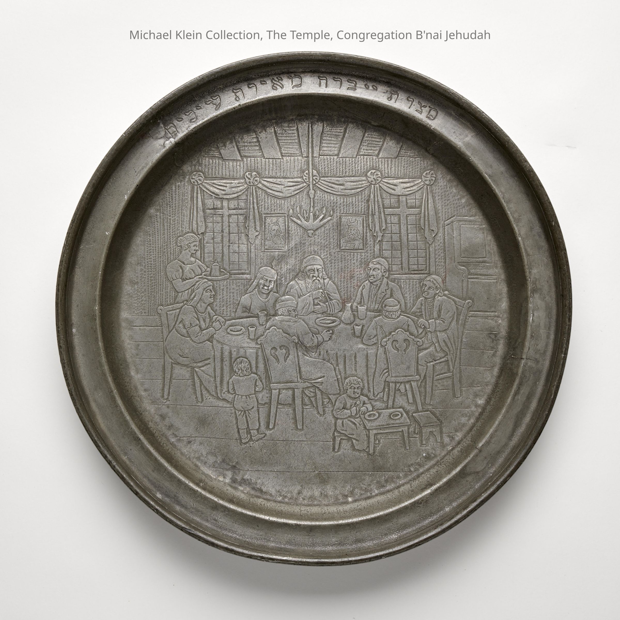 Hebrew Inscription from Psalm 19:9; "the instruction of the Lord is lucid, making the eyes light up" (Mitzvot Adonai barah m'eerat aynayim.) Portraits on the wall behind the table are Moses and Aaron. A Judenstern lamp hangs above the table; a children's table sits in the front.Made/Created