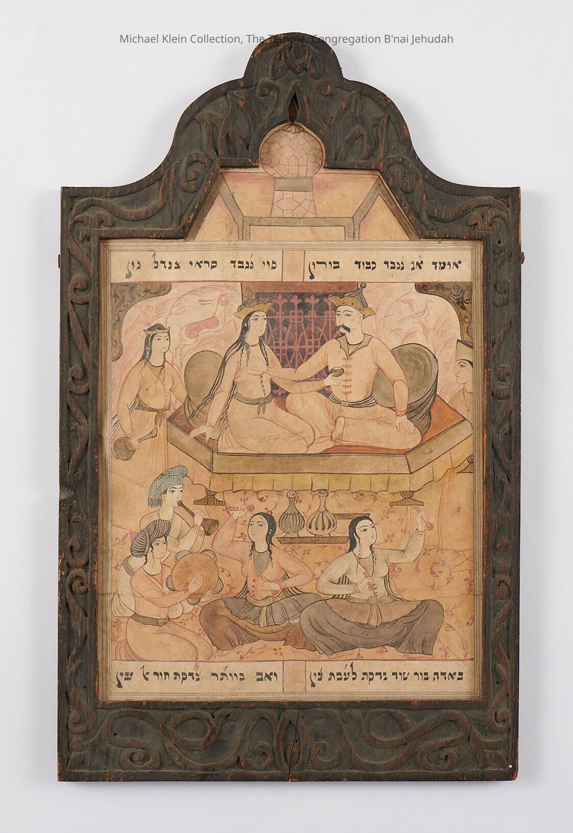 A different page from this book is described in Jewish Art (Grossman, 1995): "Ardasir Book. Persia. 17th century. In this Judeo-Persian book, the Esther story is interwoven into a classic tenth-century tale about the history of Persia. The heroes are Ardasir, who is identified with King Ahasuerus, and his sons."