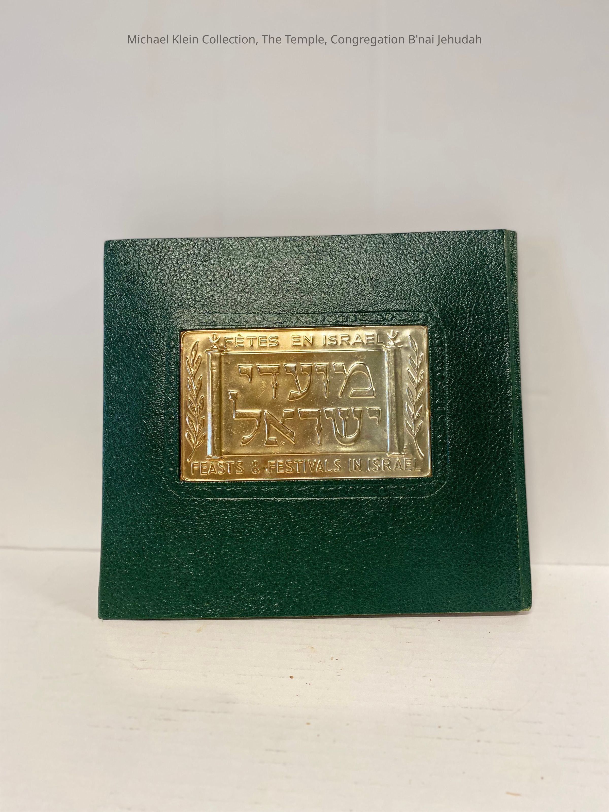 Green leather cover with thin embossed plaque. Multiple bookmarks that are stuck together. Book is written in Hebrew, English, and French.Made/Created