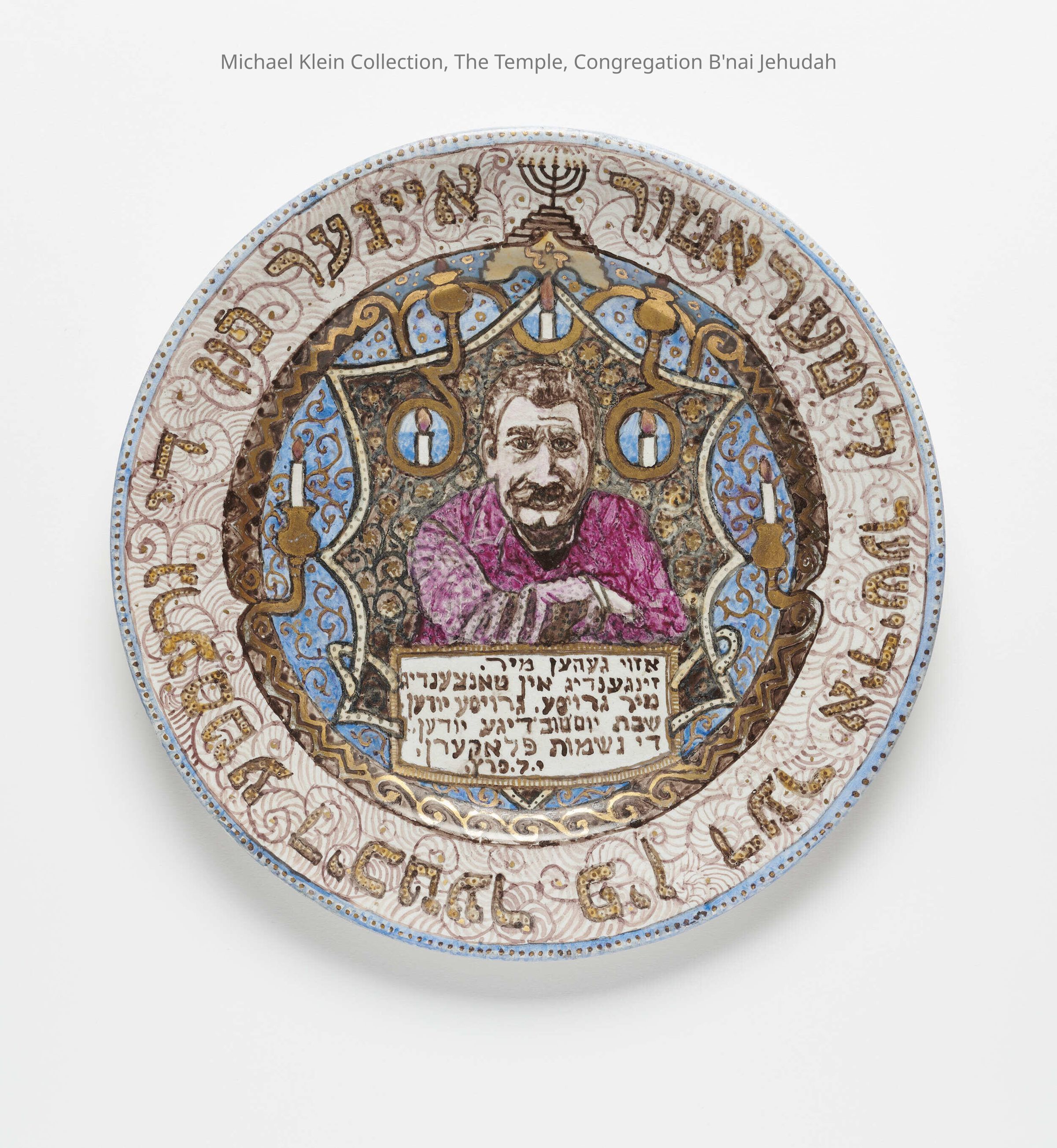 Ceramic plate in memory of the writer Yitzhak Libush Peretz (1851-1915), hand-painted, signed D.S. on back and dated 1919. Peretz was one of the most important Hebrew writers and one of the forefathers of the revival of Hebrew literature.