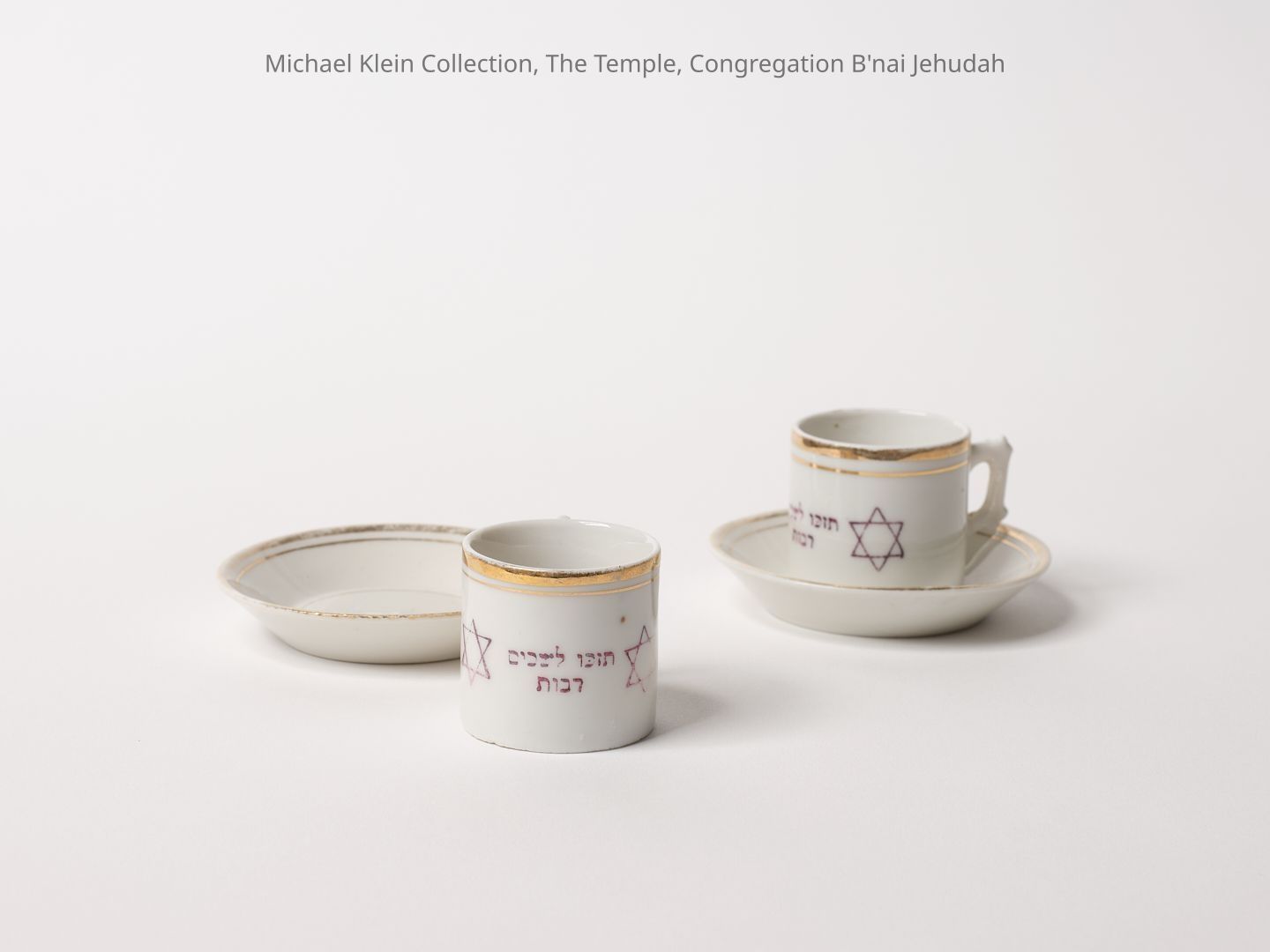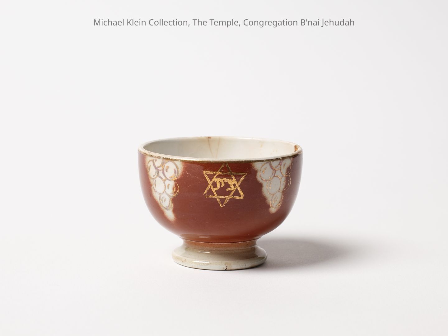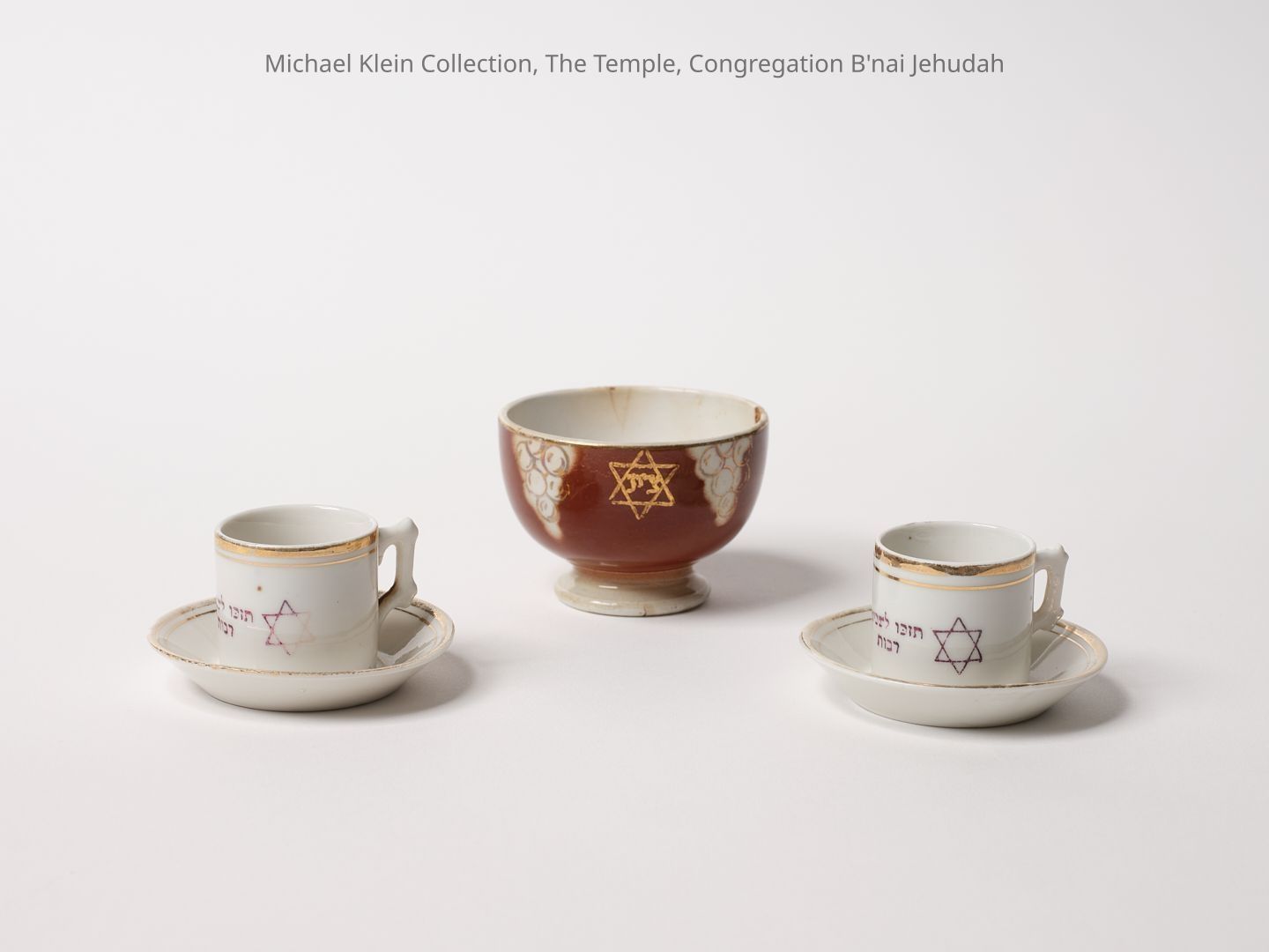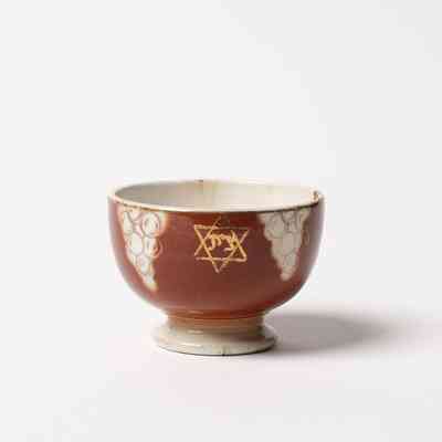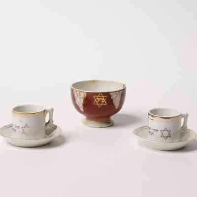 Two small handled cups with two matching saucers. The cups are inscribed with the phrase “May you merit many years”, flanked on each side by a Star of David. The rims feature a thick gold band with a thin gold line beneath it. Each cup has a handle. Also included is one brown-colored Kiddush cup, decorated with gold grape clusters, a Star of David, and the word “Zion” within it.Made/Created