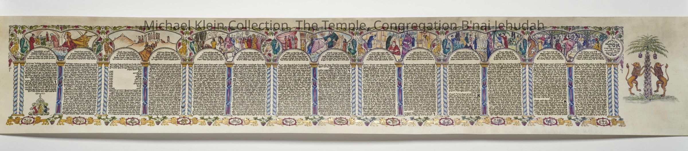 Border printed and then hand-colored and hand-lettered. Decorated with 12 zodiac signs, lions and grapes and palms. With color illustrations of the scenes of the scroll.Made/Created