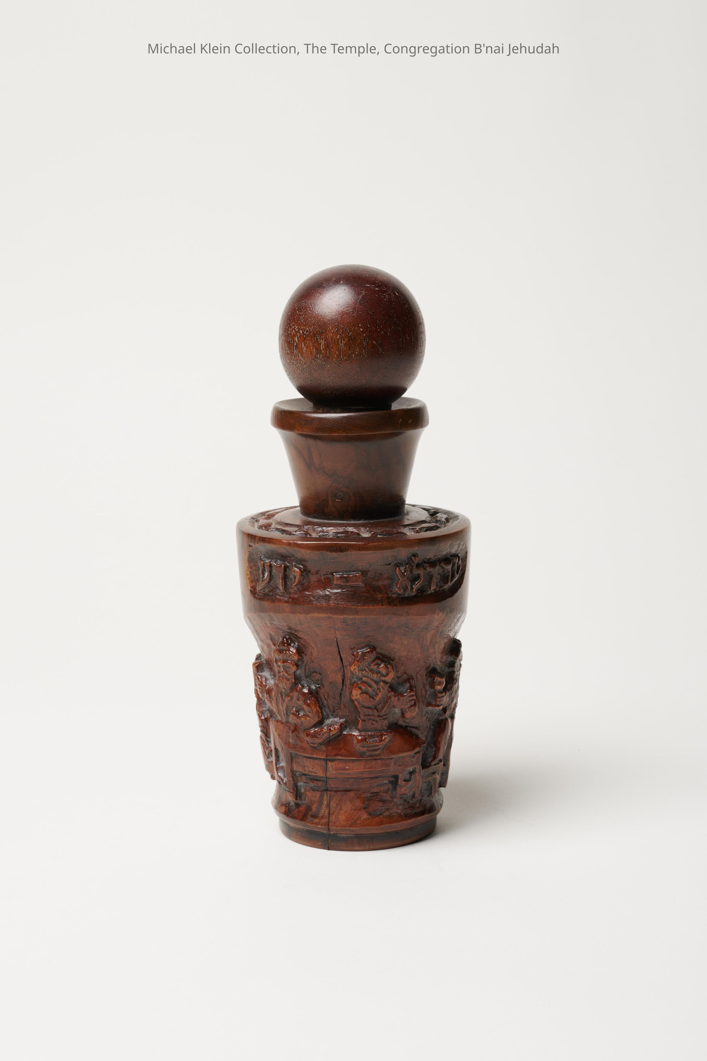 Wooden bottle with round stopper. Engraved festival scene with engraved inscriptions, including "Ad-delo-yadah," or "drink until you don't know the difference between 'cursed is Haman' and 'blessed is Mordechai."Made/Created