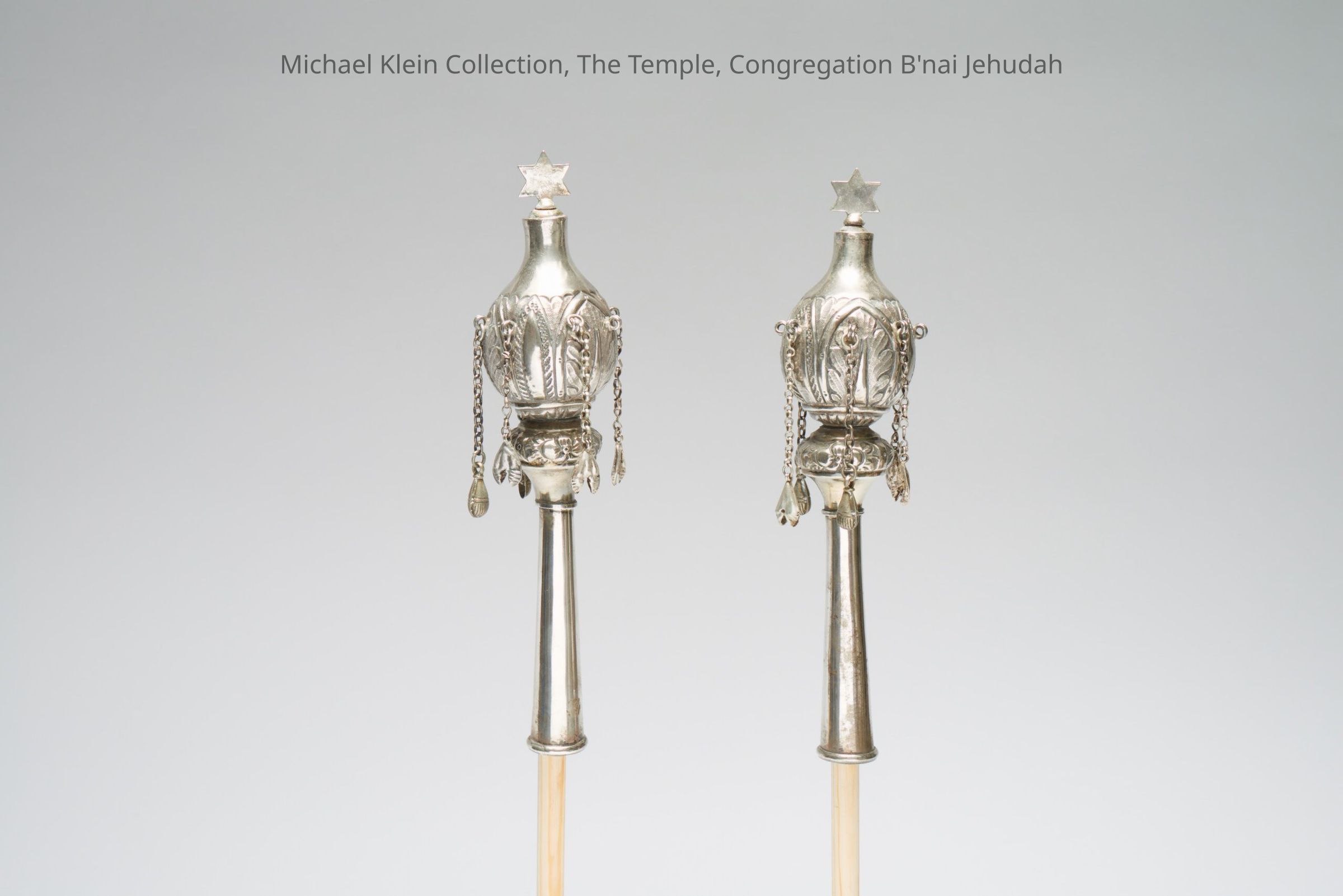 Silver pair with leaf decorations. Star on top. Repousee on surface.