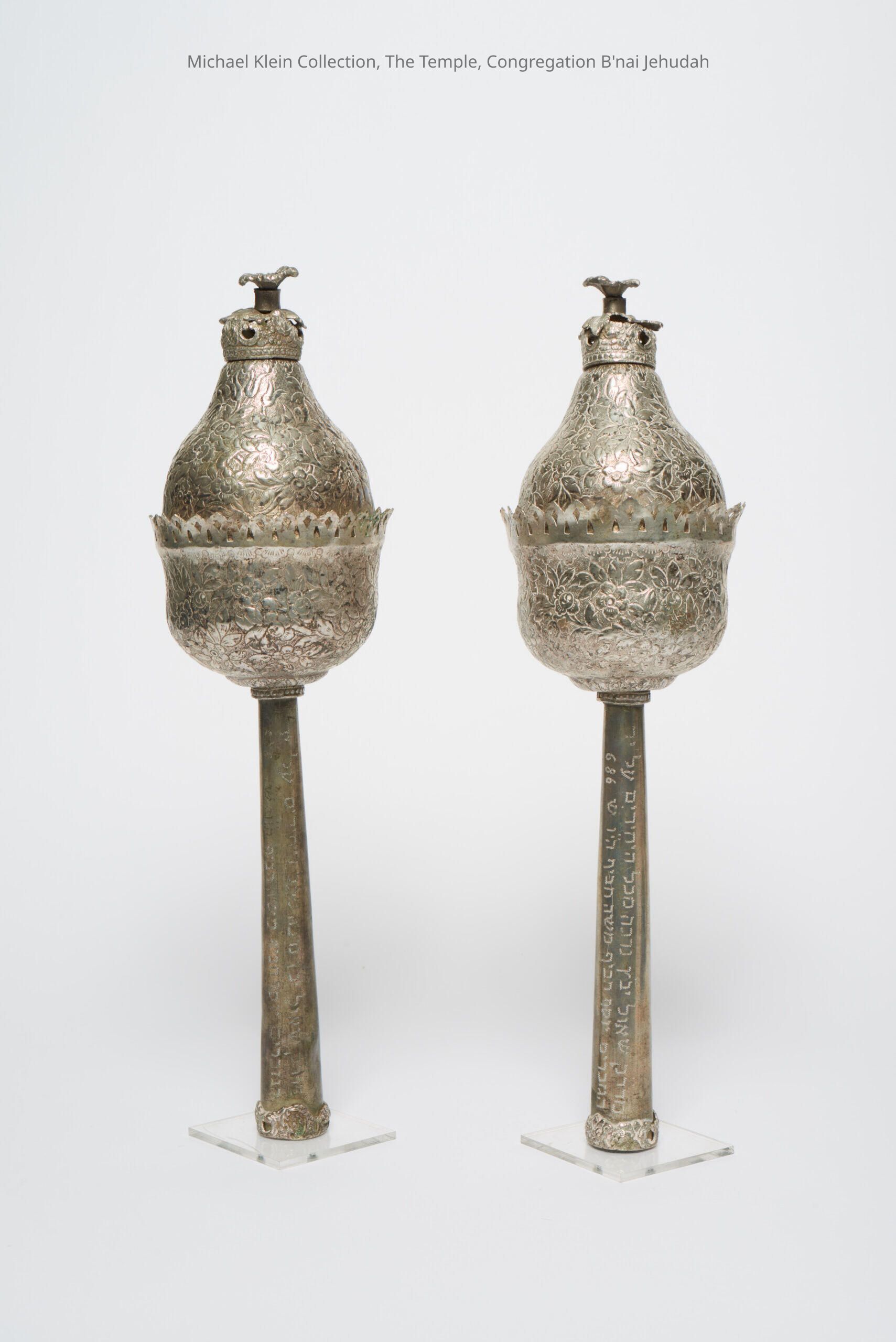 Cup-shaped bottom with conical "lid" and crown with flower finial. Detail rim at center. Engraved with flowers throughout.Made/Created