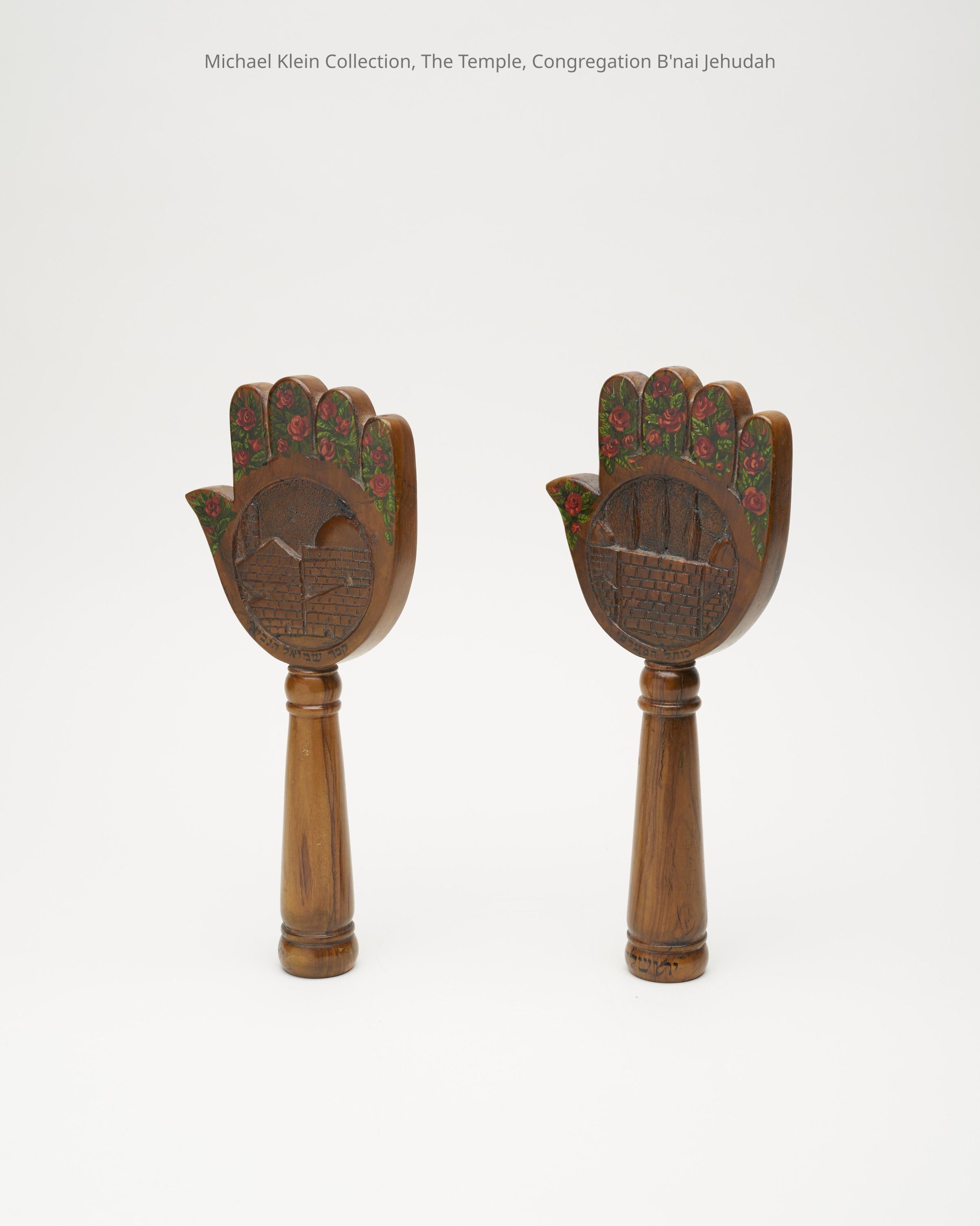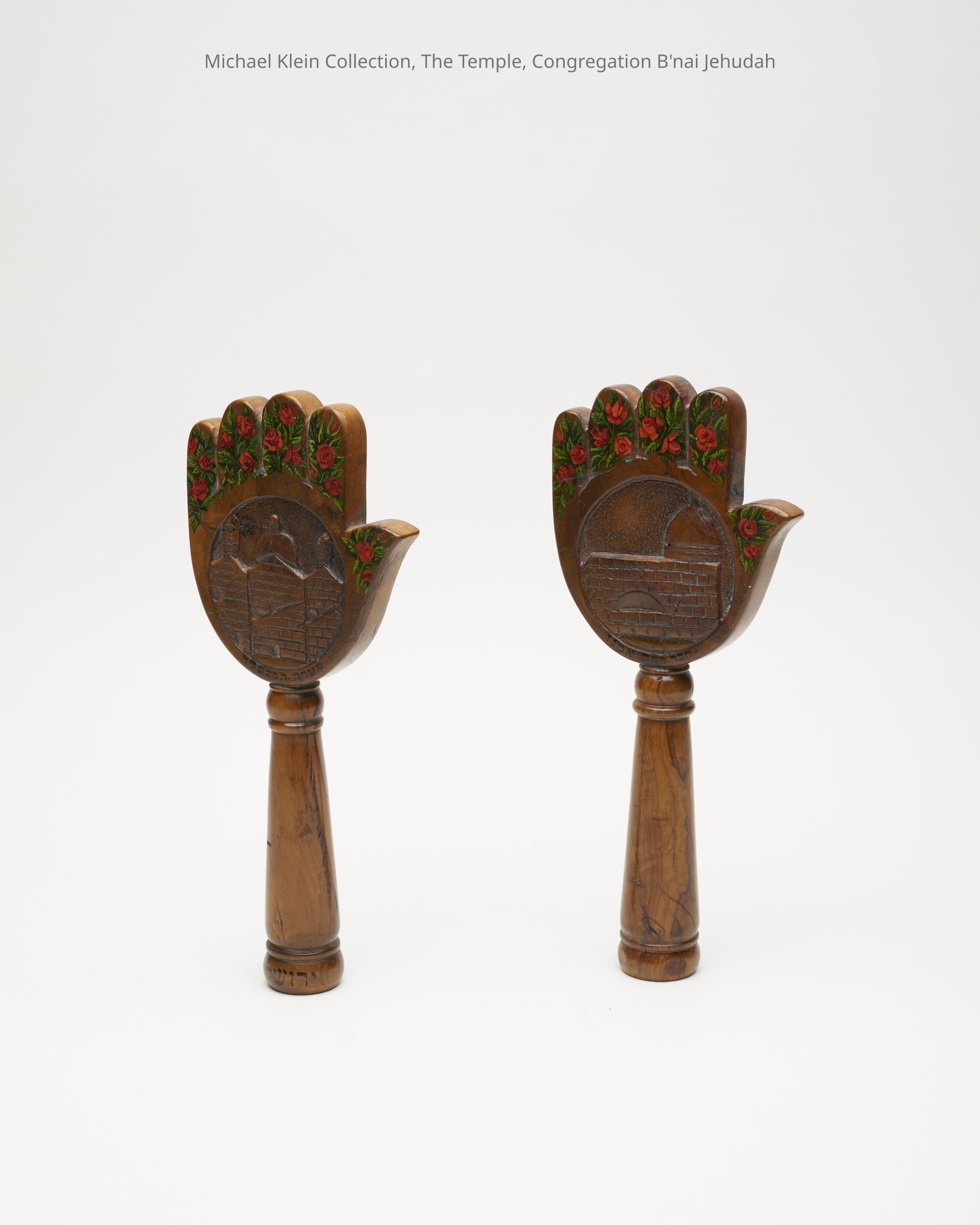 Each in the shape of a Hamsa, both sides carved with depiction of holy sites: Western Wall, Tomb of Rachel, Tomb of Samuel the Prophet, Tomb of the Patriarchs in Hebron. Painted roses and leaves on fingers.Made/Created