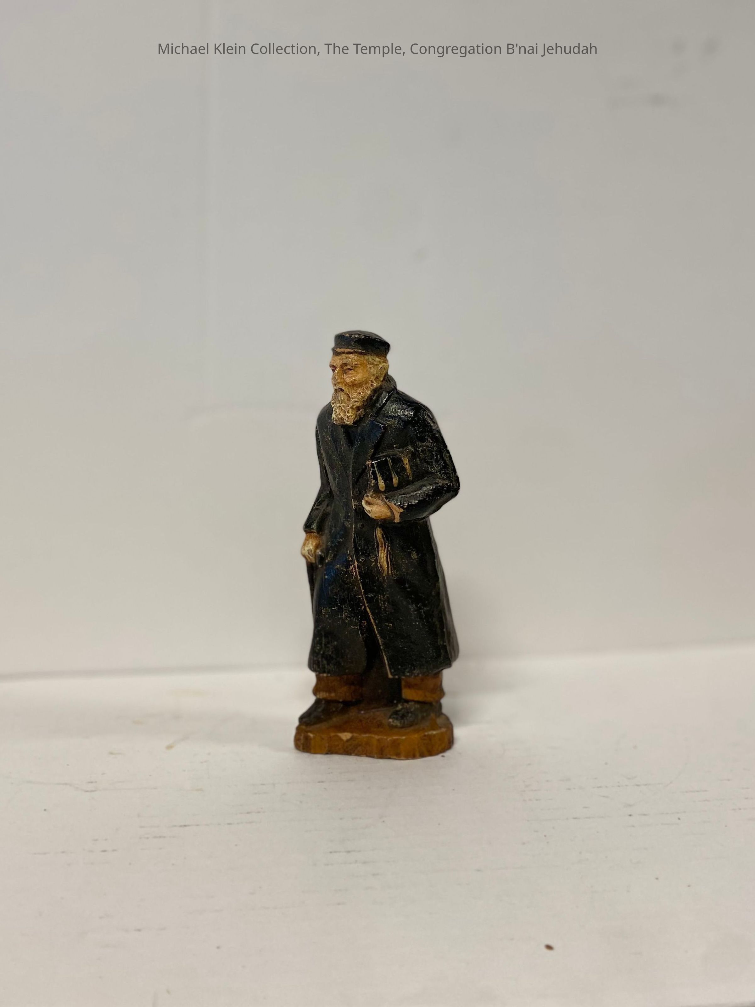 Sculpture of a Rabbi holing a book on one hand and cane in the other. Most of the color has faded from the back.