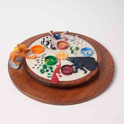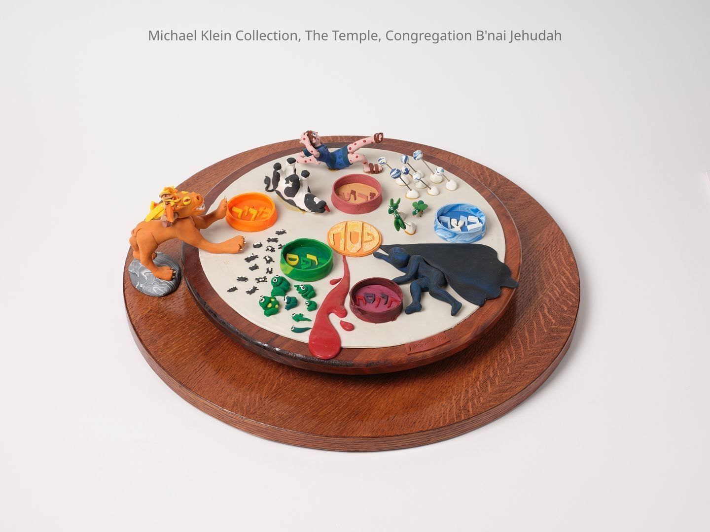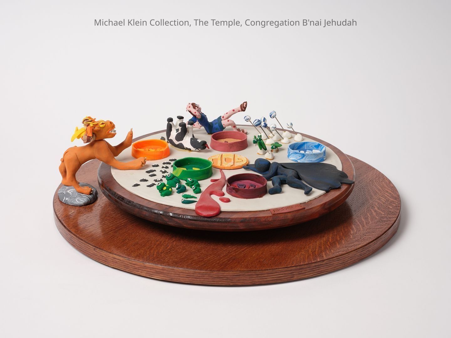 Finalist, 1996 Philip and Sylvia Spertus Judaica Prize. Commentary from the 1996 exhibition catalogue: "Because of the material, one's first impression might be one of whimsy. At closer look, the message is anything but amusing. It tells, graphically, of the plagues brought upon Egypt, but in a manner appropriate for children. As a teacher of art in a Jewish day school, I attempt to incorporate many lessons into one: Jewish history; the customs and rituals of a living Judaism, and artistic creativity, a staple of Jewish religious expression"Made/Created