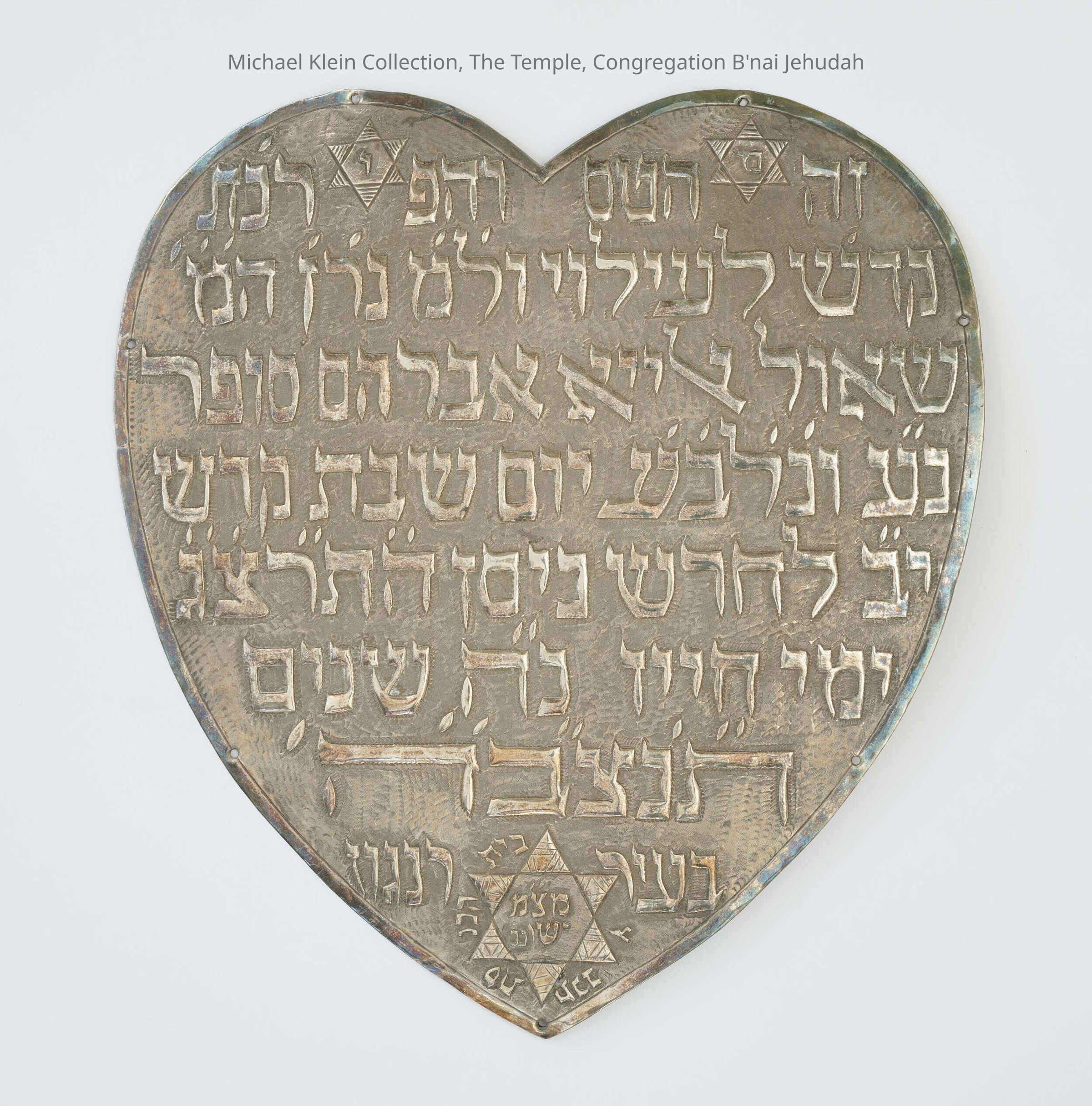 Heart-shaped dedicatory plaque ("tass"), suspended so as to overhang a Torah ark curtain. Iraqi-Jewish community of Rangoon, Burma (today Yangon, Myanmar), 5693 [1933]. Hebrew dedicatory inscription: "This is the plaque and Torah ark curtain [dedicated to] the elevation of... Shaul Elya Avraham Sofer may he rest in Eden [having] passed away on the Holy Sabbath / 12th of the month of Nissan 5693 [1933] / aged 55 years / may his soul be bound up in the bond of everlasting life." At the bottom of the plaque, encircling and inside a Star of David, is the Hebew inscription giving the name of the "Synagogue... Musemah Yeshua in the City of Rangoon." The two Hebrew initials of this synagogue appear inside two small Stars of David at the top of the plaque.Made/Created