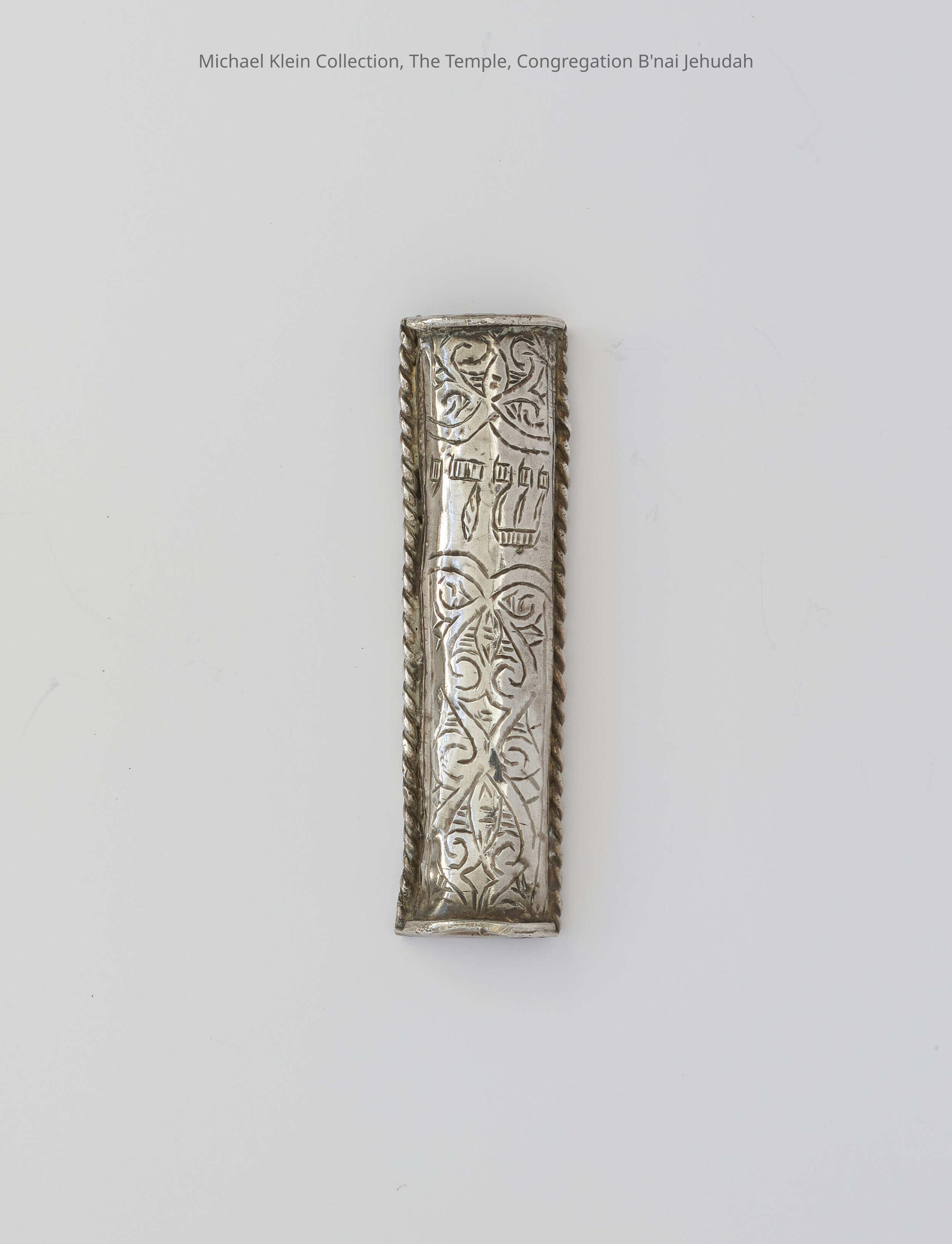 Small mezuzah case, shaped like half-cylinder, with decorations and Hebrew inscription "Shaddai" engraved over convex surface. Moroccan mezuzah cases of this type are uncommon.Made/Created