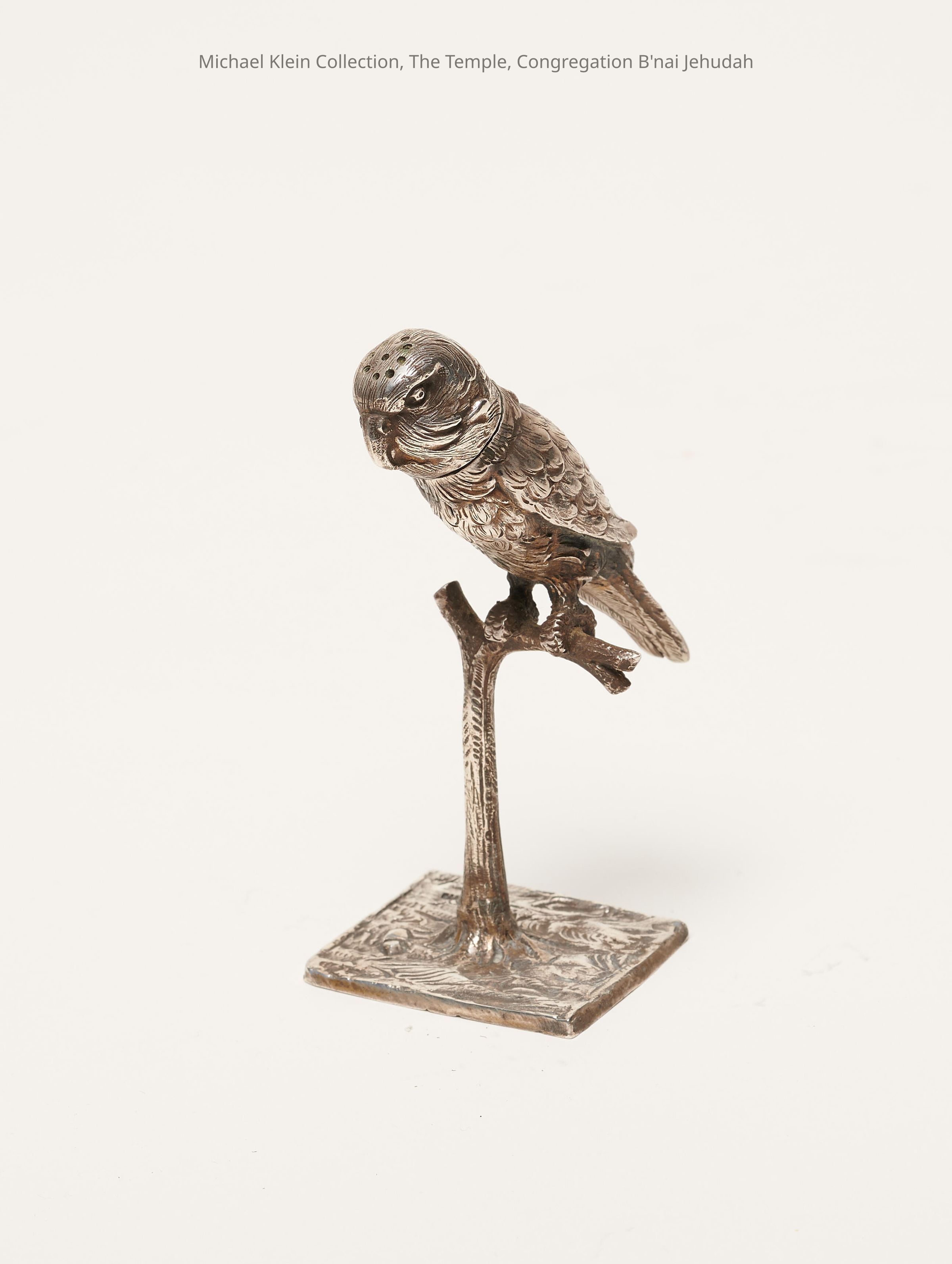 In form of a parakeet perched on a branch. Square base. Head pulls off to fill body with spices. Holes on top of head for scent to come out.Made/Created