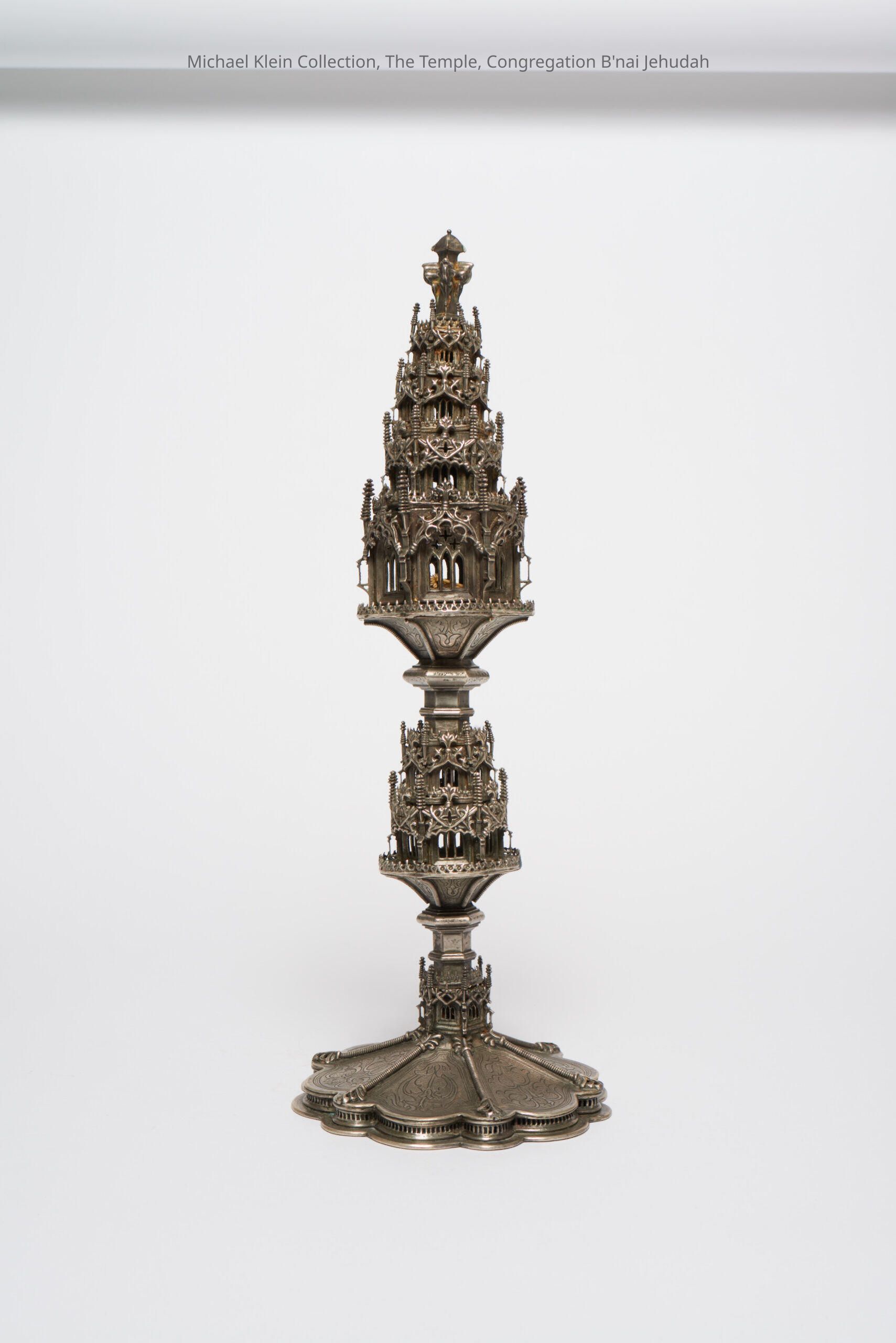 Cast and engraved. German city of Munster mark. Gothic tower style. Top opens for spices. Matches pair of rimmonim (K_0073).Made/Created
